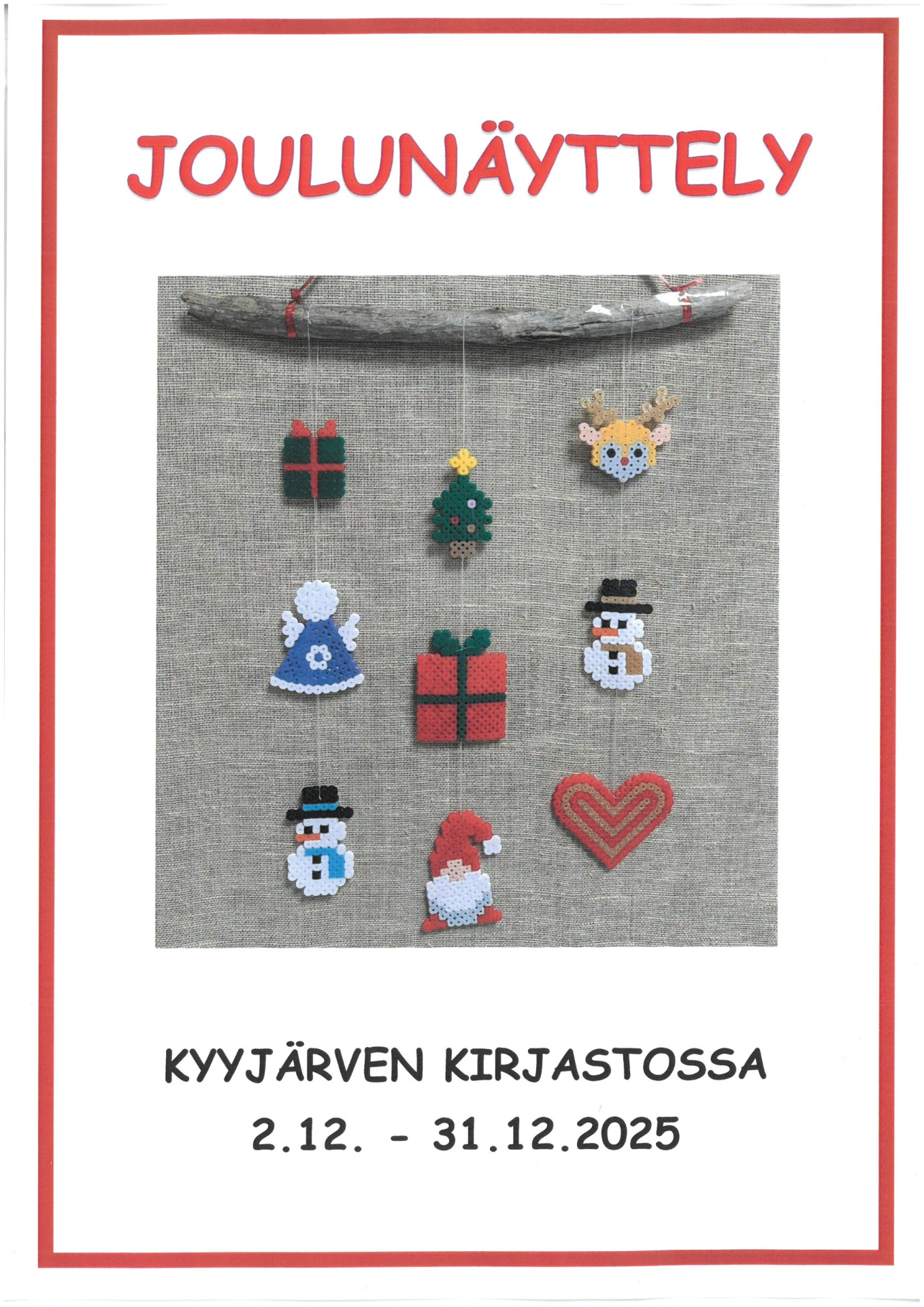 Joulunäyttely kirjastolla 2.12. - 31.12. Tehdään yhdessä joulunäyttely! Voit tuoda tähän näyttelyyn käsitöitä, askarteluja, maalauksia, tarinoita yms. Kootaan niistä yhteinen näyttely kirjaston näyttelytilaan ilahduttamaan ja luomaan joulumieltä. Töitä voit tuoda kirjastoon vielä maanantaina 1.12. klo 13 - 18.
