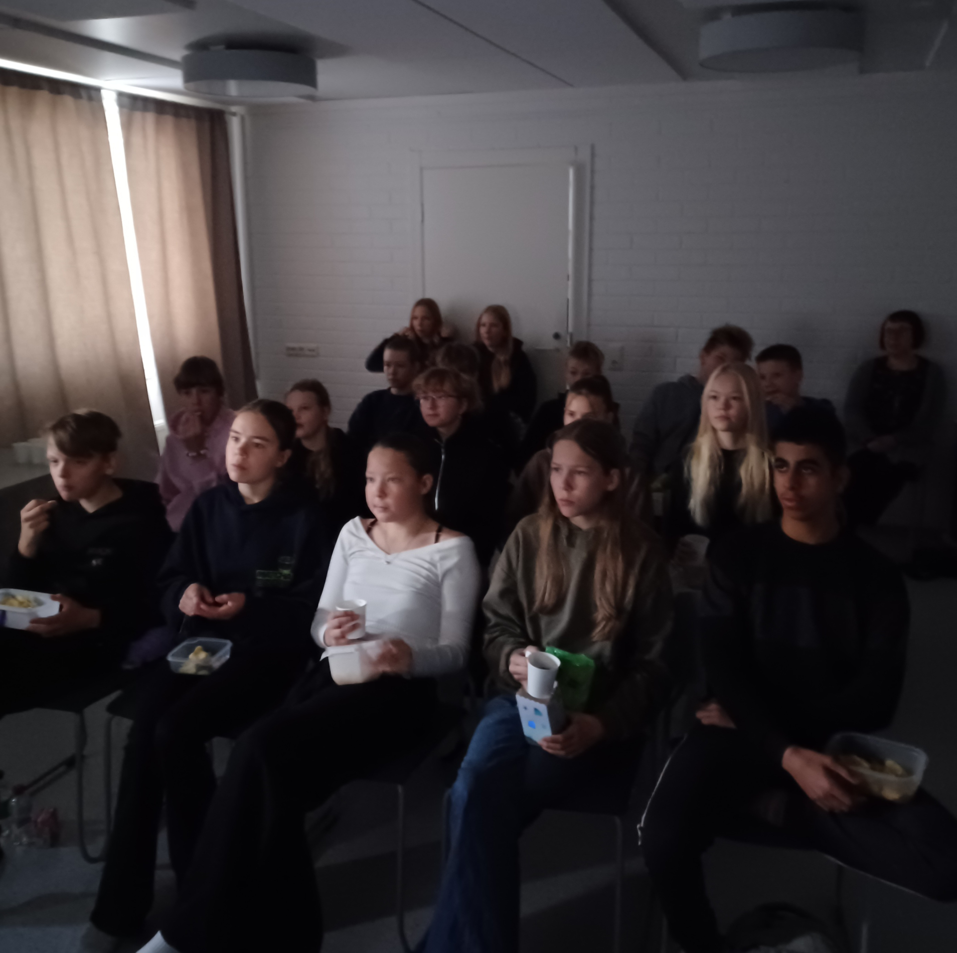 Syksyn aikana olemme myös lukeneet 7.-luokkalaisten kanssa lukupiirimäisesti erästä kirjatrilogiaa ja keskustelleet lukemastamme. Koko luokka luki KAIKKI kolme osaa. Upeaa seiskat! Palkintona hienosta lukusuorituksesta oli elokuvahetki herkuilla. Reippaat lukijat olivat sen ansainneet.