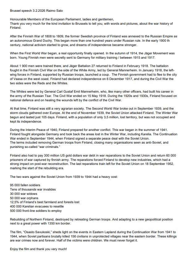 Kuvagalleriassa Raimo Salon Europarlamenttia varten kirjoitettu puhe. Sekä kuva, joka on otettu Sodankylän sotilaskodissa lokakuussa 2023 (Kuvassa Veikko Erkkilä, Mika Aaltola ja Raimo Salo).