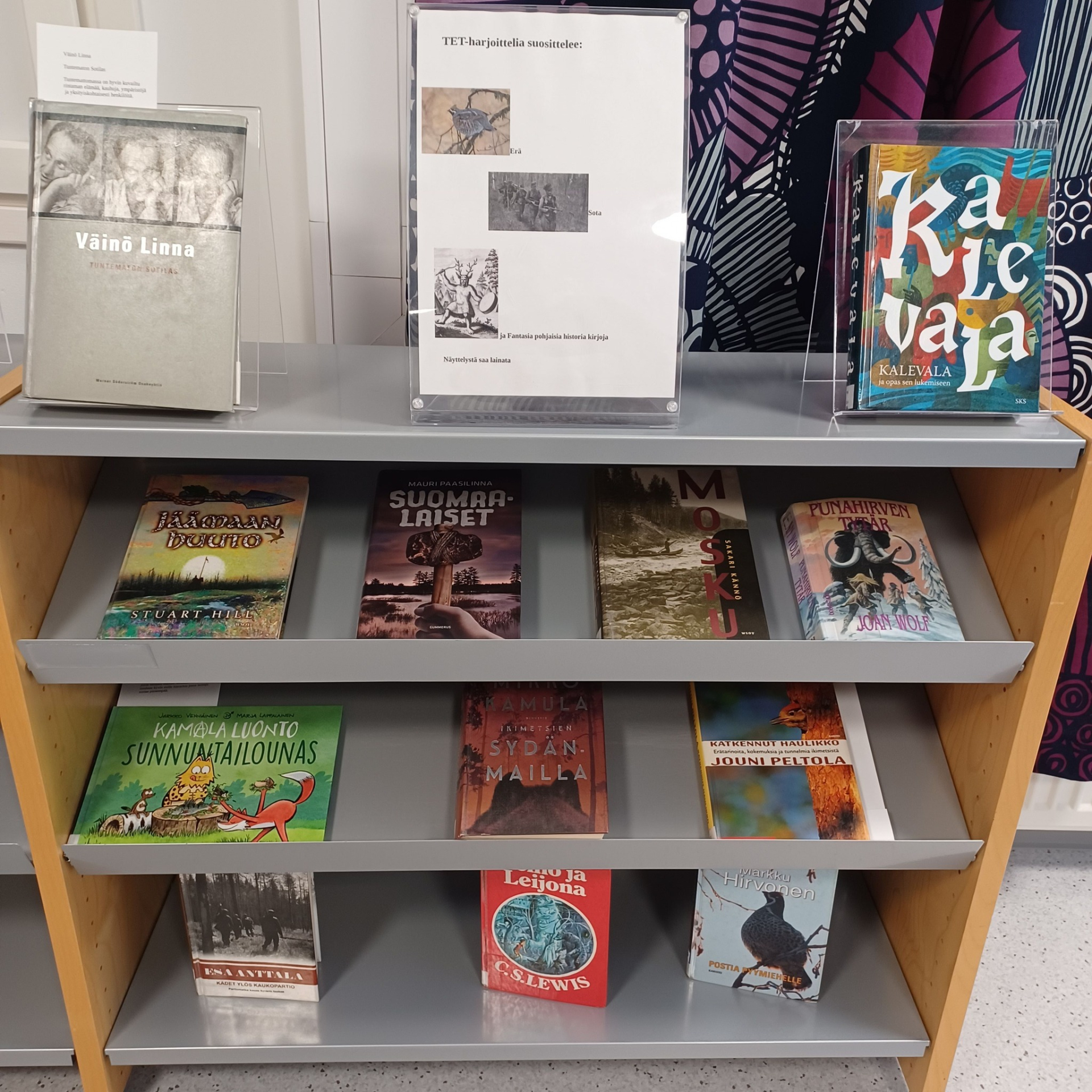Tammikuun lopulla Nopolan koulun 9. luokalla oli työelämään tutustumisen jakso (TET). Me saimme kirjastoon reippaan ja hyvällä asenteella varustetun tettiläisen, Jyrin, jolta onnistui homma kuin homma. Samalla saimme viikoksi mukavan nuorennusleikkauksen henkilökuntaan. Jyri teki viikon aikana mm. kirjanäyttelyn lehtilukusaliin hänen lukemistaan ja muillekin suosittelemistaan kirjoista. Näyttelystä saa lainata.