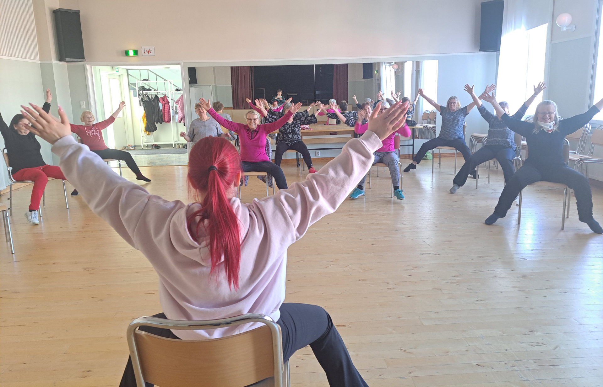 Tuolijumppa perjantaisin klo 11.30 Rientolassa (Kuva - harmi että Amandasta näkyy vain selkäpuoli eikä oikein peilistäkään.. Amanda on huippuohjaaja)