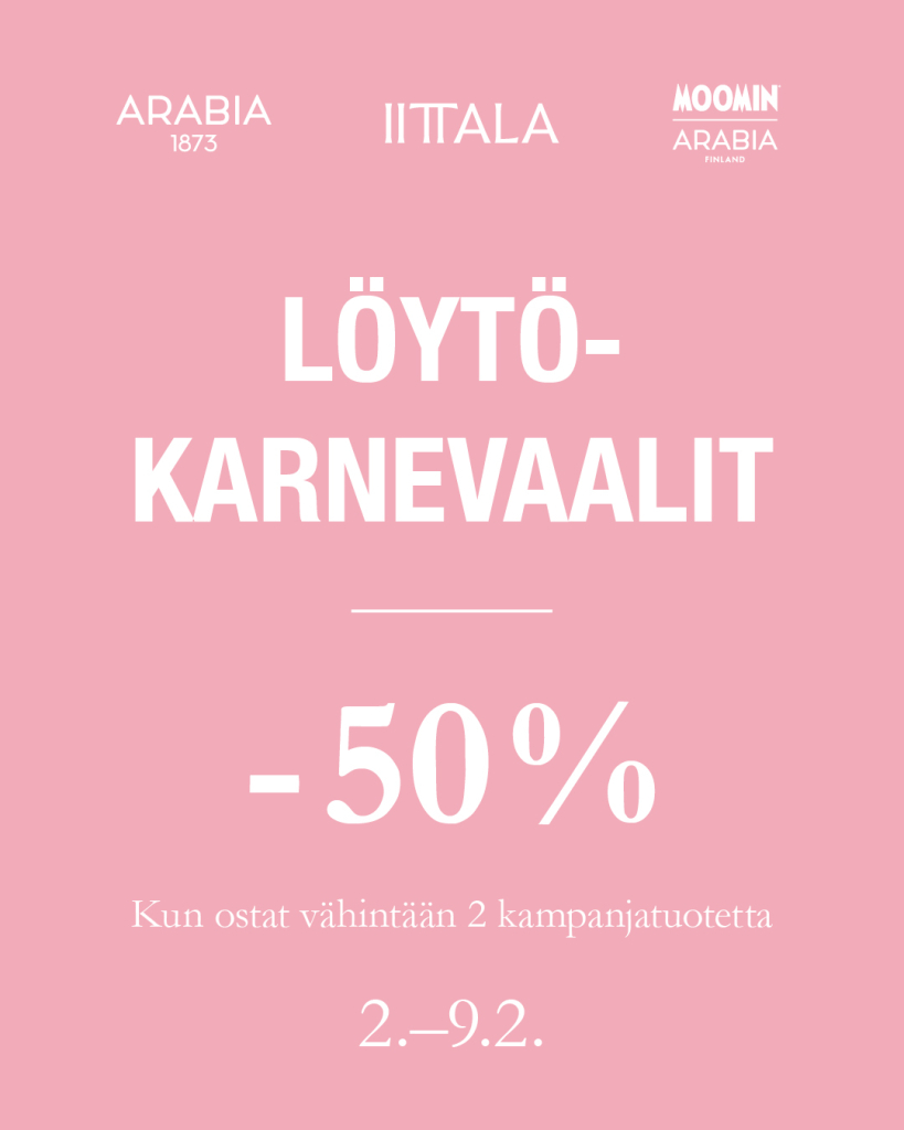 Etu on voimassa Iittala outlet -myymälöissä 9.2. asti tai niin kauan kuin tuotteita riittää.