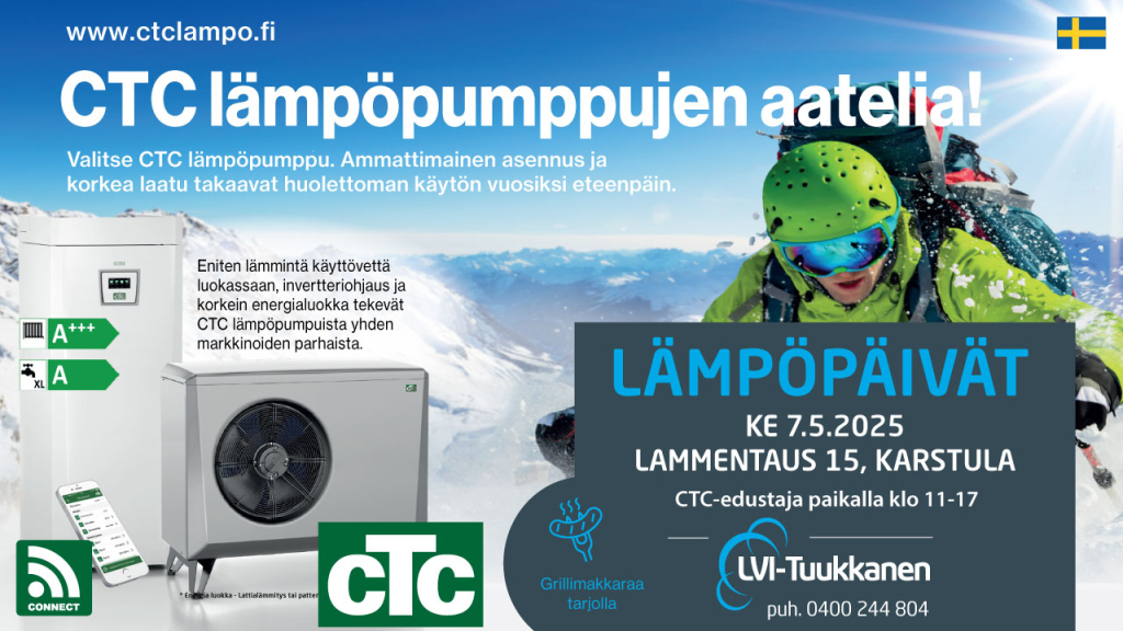 LVI-Tuukkanen Oy järjestää jo perineteeksi muodostuneet Lämpöpäivät osoitteessa Lammentaus 15 yhteistyökumppaneidensa kanssa. Esillä CTC-lämpöpumput sekä alan muita uutuuksia.