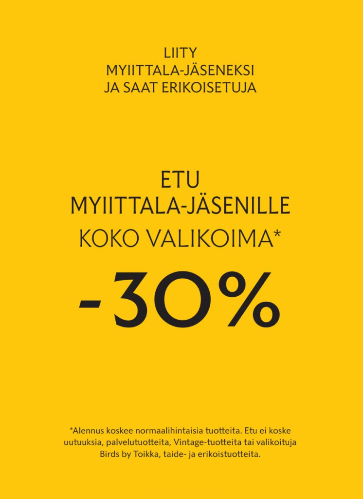 *Alennus koskee normaalihintaisia tuotteita. Etu ei koske uutuuksia, Vintage-tuotteita, palvelutuotteita tai valikoituja Birds by Toikka-, taide- ja erikoistuotteita.