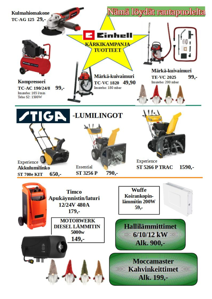 Myymälässä on edustettuna laadukkaita merkkituotteita, kuten Helkama-pyörät, NunnaUunit, Upo-kodinkoneet, Viki-kiukaat ja Stiga-puutarhakoneet.