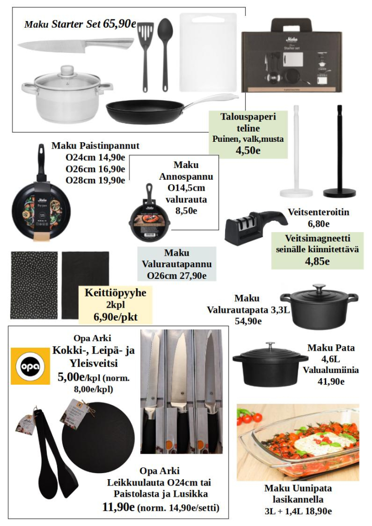 Myymälässä on edustettuna laadukkaita merkkituotteita, kuten Helkama-pyörät, NunnaUunit, Upo-kodinkoneet, Viki-kiukaat ja Stiga-puutarhakoneet.