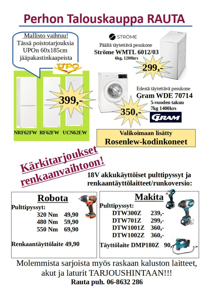 Upon jääpakastinkaappeja poistohintaan. Autoilijalle Robotan ja Makitan pulttipyssyt renkaanvaihtoon tarjoushintaan.