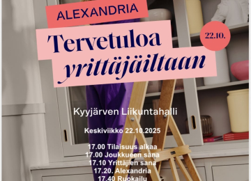 Uusimmat uutiset Vapaa-aika15.10.2025 Puikkojen viemää - novelleja ja neulontaa kirjastolla tiistaina 21.10.2025 klo 18.00 [ Lue lisää ] Työ ja yrittäminen15.10.2025 Yrittäjäilta ja lentopalloa Kutsu Yrittäjäiltaan ja lentopallo-otteluun 22.10.25 Kyy York Areenalla! [ Lue lisää ] Vapaa-aika13.10.2025 Hirvikeitolle Nyt Kyyjärven Erämiehet ry:n Hirviseurue kutsuu maanomistajat, kyläläiset, seuran jäsenet sekä... [ Lue lisää ] Kulttuuri12.10.2025 Dokumentti-ilta: Osasto Savukoski - partisaanien jäljillä Raimo Salon ohjaama dokumentti: Osasto Savukoski - partisaanien jäljillä esitetään Kyyjärven... [ Lue lisää ] Seniorit10.10.2025 Kivirannan syksyn kuulumisia Kivirannassa vietettiin omaisten päivää 15.9.2025. Paikalle oli kokoontunut ilahduttava määrä... [ Lue lisää ] Hyvinvointi09.10.2025 Keski-Suomen hyvinvointialueen palvelustrategia- ja palveluverkkoesityksiä voi arvioida 8.10.–5.11. aikana [ Lue lisää ] Työ ja yrittäminen09.10.2025 Elinvoimakahvit koko Sydänsuomessa-alueen yrittäjille! Hei Kannonkoski, Karstula, Kinnula, Kivijärvi, Kyyjärvi, Pihtipudas ja Viitasaari – nyt... [ Lue lisää ] Vapaa-aika09.10.2025 Tiedätkö jonkun, joka voisi hyötyä pienestä avusta arjessa? Yhdessä voimme tehdä arjesta kevyempää. Jaamme ESR+:n tukemia ruokalahjakortteja, jotta apu... [ Lue lisää ] Kunnalliselämä08.10.2025 Avoin kutsu: Keskustelutilaisuus kunnanhallituksen kanssa to 9.10.klo 18 Jarkko, Johanna, Jaana, Jouko, Anneliina,Tapani ja Janne, tapaamme kunnanhallituksen torstaina 9.... [ Lue lisää ] Liikunta ja urheilu07.10.2025 Juoksu, hiihto ja keilatuloksia 2025 Jarmo Lautaselle Nivalassa su 17.8.2025 SM kulta ja hopea. Teerijärvellä la.9.8.2025 toiseksi.... [ Lue lisää ] Kulttuuri07.10.2025 Lehtitoiveita ja muuta palautetta Ensi vuoden lehtitilauksien aika lähenee. Nyt on mahdollisuus vaikuttaa lehtivalikoimaamme. Mitä... [ Lue lisää ] Lapset ja nuoret06.10.2025 Syyslomalle tekemistä! [ Lue lisää ] Hyvinvointi06.10.2025 IHMISEN HYVINVOINTI Hyvinvointi on ihmisen elämisen ja toimimisen lähtökohta. Hyvinvoiva ihminen jaksaa paremmin... [ Lue lisää ] Seurakunnat02.10.2025 Lokakuun tapahtumia Kyyjärven kappeliseurakunnassa Lokakuussakin seurakunnassa tapahtuu: [ Lue lisää ] Kulttuuri02.10.2025 Syyskuulumisia kirjastosta [ Lue lisää ] Maa ja metsätalous02.10.2025 Tervetuloa Kyyjärvelle Metsät & vesi -tupailtaan 29.10.25 klo 18-20 Metsät & vesi -tupailta Aika: 29.10.2025 klo 18:00 - 29.10.2025 klo 20:00 Paikka... [ Lue lisää ] Lapset ja nuoret02.10.2025 Myyjäiset Paletissa pe 3.10 Karstulan lukion 2A oppilaat järjestävät myyjäiset Paletissa perjantaina 3.10.2025 klo 10.00 alkaen. [ Lue lisää ] Lapset ja nuoret02.10.2025 KOULUIKÄISTEN HARRASTUSKALENTERI Kerho- ja harrastusvuosi on jo aloittanut toimintansa, mutta vielä ehtii mukaan!... [ Lue lisää ] Asuminen01.10.2025 Sadonkorjuu – Osallistavan asuinympäristön tapahtuma Tule mukaan pohtimaan, millainen voisi olla virkeä ja viihtyisä pihapiiri nyt ja tulevaisuudessa!... [ Lue lisää ] Kulttuuri01.10.2025 Poistomyynnin loppuhuipennus Kirjaston poistomyynnissä on meneillään loppuhuipennus. Nyt kaksi poistokirjaa maksaa yhteensä 50... [ Lue lisää ] Vapaa-aika30.09.2025 Viime hetken muistutus kansalaisopiston maksuista ja rahanarvoisista eduista Lokakuussa alkaa kansalaisopiston kurssimaksujen laskutus. Jos haluat maksaa esim. Smartum saldo-... [ Lue lisää ] Liikunta ja urheilu30.09.2025 Harsunkangas - Oikari monikäyttöreitistön kehittämishankkeen kuulumisia 3 Reitistöhanke etenee loppusuoralle - uutta maastossa! [ Lue lisää ] Hyvinvointi29.09.2025 Sale Kyyjärven aukiolomuutoksia Sale Kyyjärven remontista johtuen on aukioloaikoihin joitakin muutoksia. [ Lue lisää ] Liikunta ja urheilu28.09.2025 KyKy-Betset vs Kokkolan Tiikerit To 2.10. Klo: 18:30 [ Lue lisää ] Hyvinvointi26.09.2025 Seniorin hyvinvointineuvola Kivirannassa Vanhusten viikolla ma 6.10. klo 10.00-13.00 Paula Kuusela tavattavissa Kivirannassa. [ Lue lisää ] Seniorit26.09.2025 Toimitaan yhdessä Tervetuloa kaikki osallistumaan, kuuntelemaan, tapaamaan, tutustumaan... [ Lue lisää ] Hyvinvointi24.09.2025 Luonnossa oleskelun ja liikkumisen suositus 3-30-300 3–30–300 -luontosuositus tarjoaa eväät terveyden ja hyvinvoinnin lisäämisen matkalle. Meidän... [ Lue lisää ] Seniorit23.09.2025 Seniorikeskus verkossa tukee ikääntyvien itse- ja omahoitoa [ Lue lisää ] Kulttuuri22.09.2025 Poikkeus kirjaston aukiolossa Torstaina 25.9.-25 kirjastossa järjestetään kirjavinkkausta koululaisille. Tästä johtuen kirjasto... [ Lue lisää ] Hyvinvointi21.09.2025 Ruokalahjakortteja jaossa Kyyjärven SPR:llä Kyyjärven Punainen Risti jakaa ruokalahjakortteja ESR+ -tuella – autetaan yhdessä niitä, jotka apua... [ Lue lisää ] Meiltä ja muualta20.09.2025 Suomenhevosen todennäköisestä ja todellisesta historiasta (osa 2) Kertojana Hannes Keskitalo Suomenhevonen on työskennellyt Hokkalassa 300 vuotta. Se on ollut korvaamaton ympärivuotinen... [ Lue lisää ] Hyvinvointi19.09.2025 Miksi niin moni nuori voi huonosti-verkkovanhempainilta Turvallinen ja tasapainoinen arki kotona ja koulussa luo perustan nuoren hyvinvoinnille, ja... [ Lue lisää ] Vapaa-aika19.09.2025 Kyyjärven Osuuspankin sijoitusilta to 25.9. Tervetuloa Kyyjärven Osuuspankin ja United Bankersin järjestämään sijoitusiltaan! [ Lue lisää ] Liikunta ja urheilu18.09.2025 Kyy York Areenan liikuntasalivuorot kaudelle 2025-2026 Alla olevasta linkistä näet varatut liikuntasalivuorot. [ Lue lisää ] Seurakunnat17.09.2025 Siionin kannel tutuksi - ilta seurakuntasalissa 18.9. kello 18 Tulepas laulamaan ja opettelemaan tai kuuntelemaan Siionin kannelta. Monta vuotta sitten on... [ Lue lisää ] Kulttuuri17.09.2025 Poistomyynti kirjastossa Kirjaston kokoelmasta poistettua aineistoa myynnissä kirjastossa ajalla 18.9. - 2.10.2025.... [ Lue lisää ] Hyvinvointi17.09.2025 DIGIDTÄ VOIMAA-TYÖKALUT ARJEN 