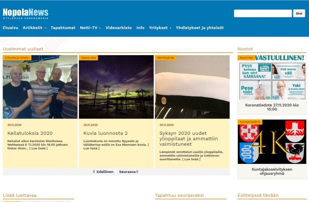 Sinisestä yläpalkista löytyy Vanhasta Nopolanewsista tuttuja elementtejä. Painikkeet etusivu ja artikkelit toimivat samoin kuin aikaisemminkin. Tapahtumat vie sinut suoraan tapahtumakalenteriin. Tuttua on myös Netti-tv ja videoarkisto sekä Info painikkeet.