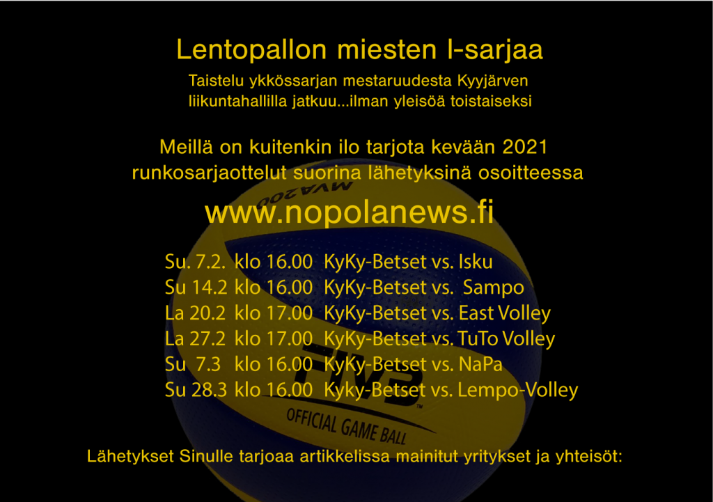 Ykkösarjassa tällä hetkellä hienosti toisena majaileva Kyky-Betset pelaa helmi-maaliskuussa peräti kuusi kotiottelua. Turusta vieraaksi saapuu sarjaa johtava TuTo Volley ja pohjoisin vieras on puolestaan NaPa Rovaniemeltä. Idän suunnalta Kyyjärvelle saapuvat East Volley Savonlinnasta ja Sampo Pielavedeltä. Tampereen seudun lentopalloperinnettä edustavat kevään aikana Rantaperkiön Isku ja Lempo-Volley Lempäälästä.