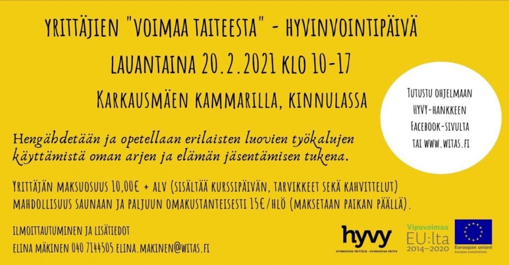 Hyvy tarjoaa Saarijärven-Viitasaaren seutukunnan yksin- ja mikroyrittäjille Voimaa taiteesta – hyvinvointipäivän Karkausmäen Kammarilla Kinnulassa lauantaina 20.2.