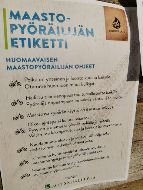 Ennen reitille lähtöä käytiin läpi Suomen Ladun Maastopyöräilyn etikettiä; mitä vastuita ja velvollisuuksia meillä on maastossa ajaessa. Maastopyöräilyn ajotekniikkaa turvalliseen ajamiseen sekä opeteltiin yleisimmät käsimerkit, jotka ovat ryhmäajossa perusasioita.