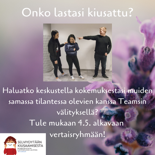 Selviydytään kiusaamisesta-projekti järjestää kiusattujen nuorten vanhemmille suunnattua vertaisryhmätoimintaa. Vanhempien vertaisryhmässä pääsee ohjatusti keskustelemaan oman lapsen kiusaamiskokemuksen herättämistä tunteista ja ajatuksista toisten samaa kokeneiden vanhempien kanssa. Teemoina vanhempien vertaisryhmässä ovat mm. lapsen kiusaamiskokemuksen herättämät tunteet, vanhemman oma jaksaminen sekä nuoren tukeminen ja teidän molempien vahvuuksien löytäminen.