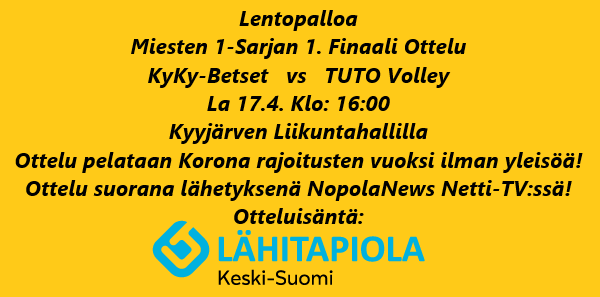 (2 Ottelua + Otteluvoittojen ollessa tasan, pelataan ns. Kultainen erä (25p). Voittaja on 1-Sarjan Mestari) Linkki Lentopalloliiton Tulospalvelusivustolle 1. Finaali Ottelu KyKy-Betset vs TUTO Volley La 17.4. Klo: 16:00 Linkki: https://www.nopolanews.fi/nopola-news-air-kanava-1 Lähetys alkaa hyvissä ajoin ennen ottelua, Noin Klo: 15:30. Tervetuloa Linjoille! KyKy-Betsetin Kotisivut: https://kyky-betset.sporttisaitti.com/ Ottelut Ja Sarjataulukko: |