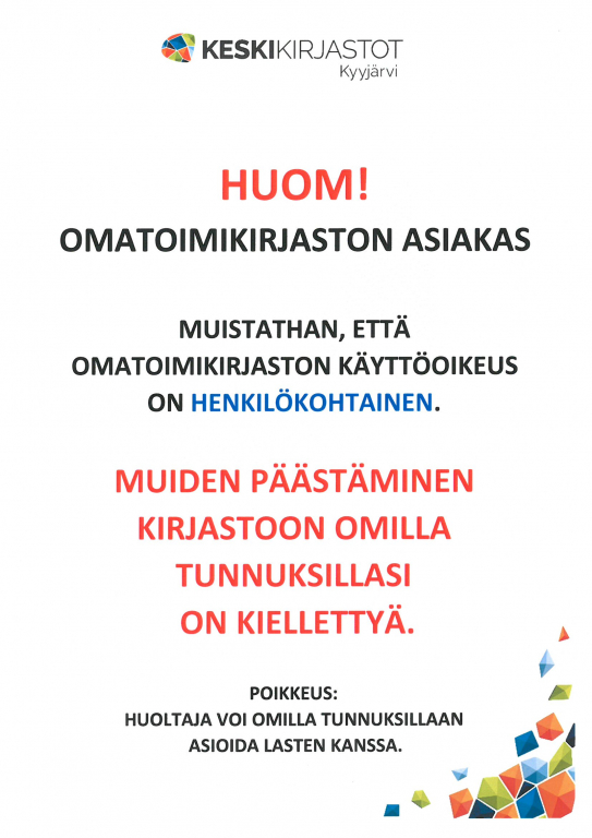 Omatoimikirjasto avoinna joka päivä klo 7 - 21 sopimuksen allekirjoittaneille. Ja muistutuksena vielä, että sopimus on henkilökohtainen. Muiden päästäminen kirjastoon omilla tunnuksillasi on kiellettyä. Omatoimikirjaston toimintaan pääset tutustumaan tämän videon avulla: Kyyjärven omatoimikirjasto