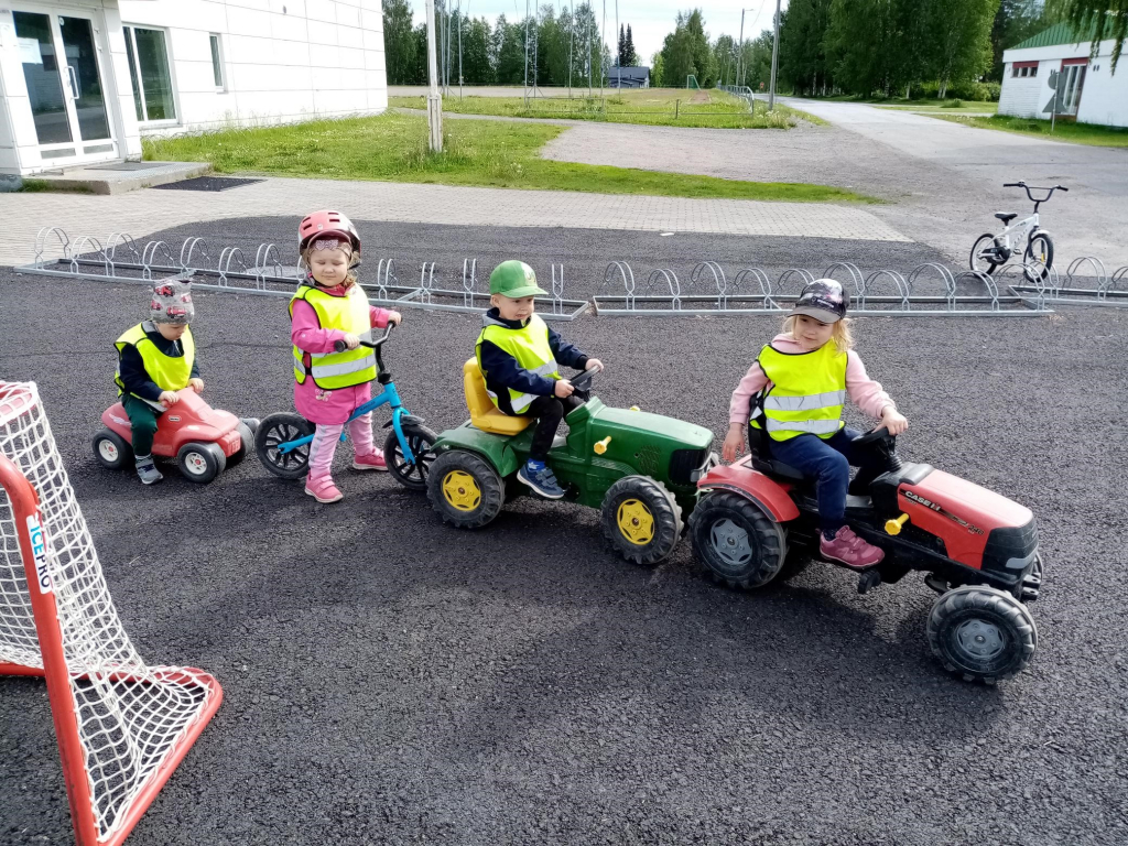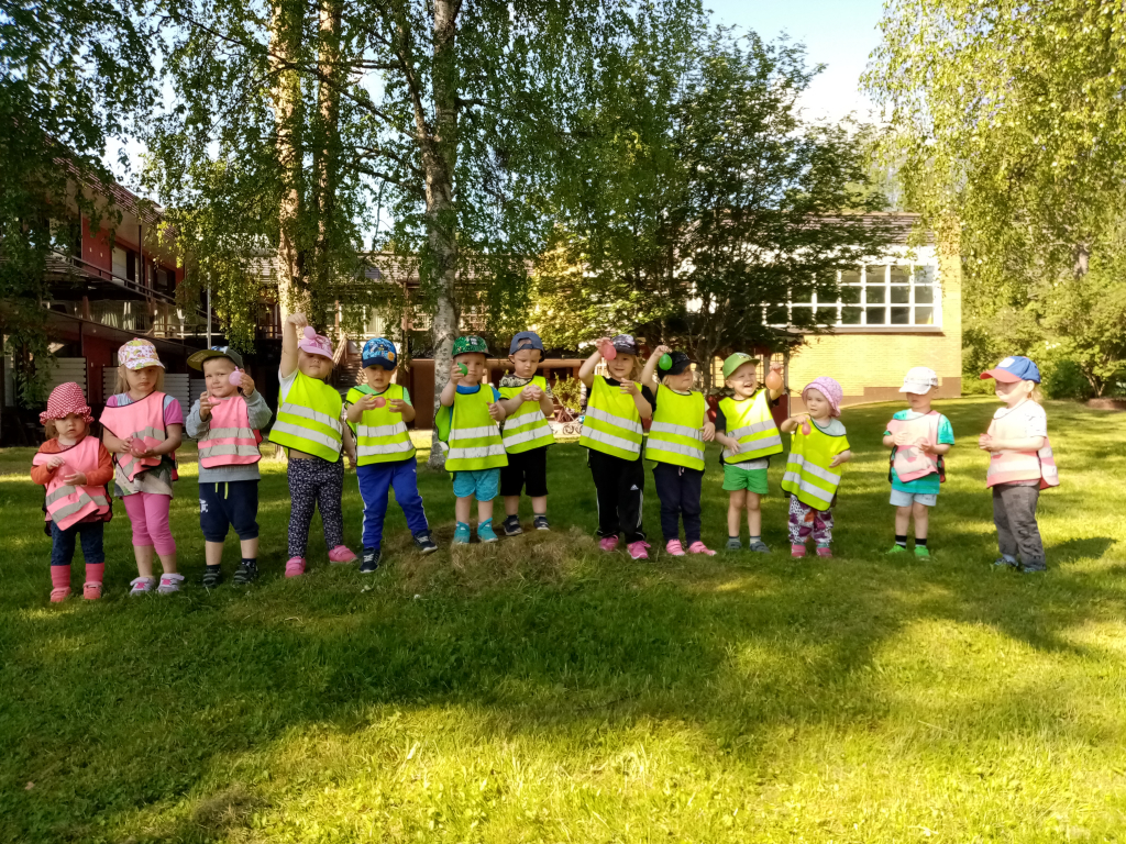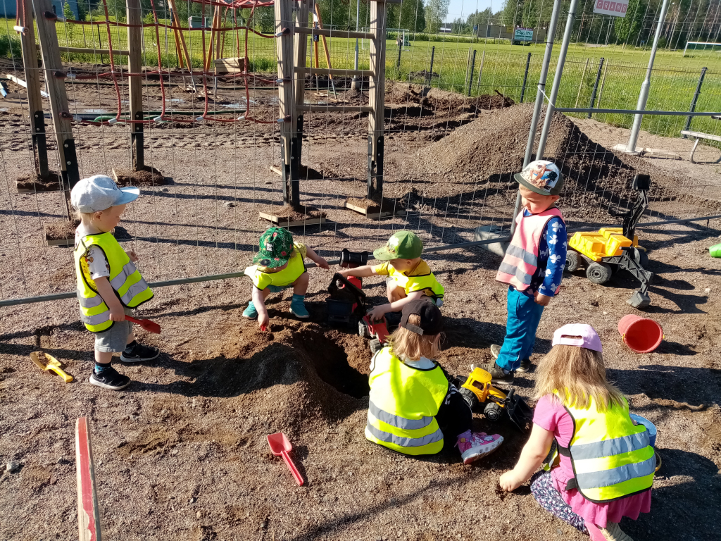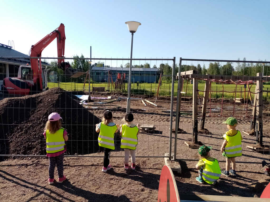 Nopolan päiväkodin pikkuiset 0-3 -vuotiaat ovat touhunneet monenlaista loppukevään ja alkukesän aikana! Olemme tehneet paljon retkiä lähiympäristöön, muun muassa metsään, satamaan, kirjastoon, kylälle, monnarille ja urheilukentälle. Olemme ulkoilleet paljon myös päiväkodin pihassa ja toimintapuistossa. Kesäkuussa käynnistyi päiväkodin kauan kaivattu piharemontti! Lapset ovat päässeet seuraamaan koko ajan pienenevältä ulkoilualeelta aidan takana työskenteleviä kaivinkoneita, traktoreita ja sora-autoja. Päiväkodin piha saa tekonurmipinnan, pienen asfalttialueen sekä muutaman uuden ulkoleikkivälineen. Näistä mainittakoon lasten toivoma hämähäkkikeinu! Aitojen ulkopuolelle on istutettu muutamia puita ja nyt myös pihan keskelle saadaan ihania istutuksia. Jännityksellä odotamme, miltä piha näyttää, kun elokuussa päiväkoti taas avaa ovensa muutaman viikon sulun jälkeen!