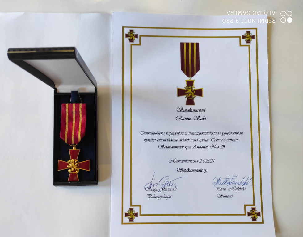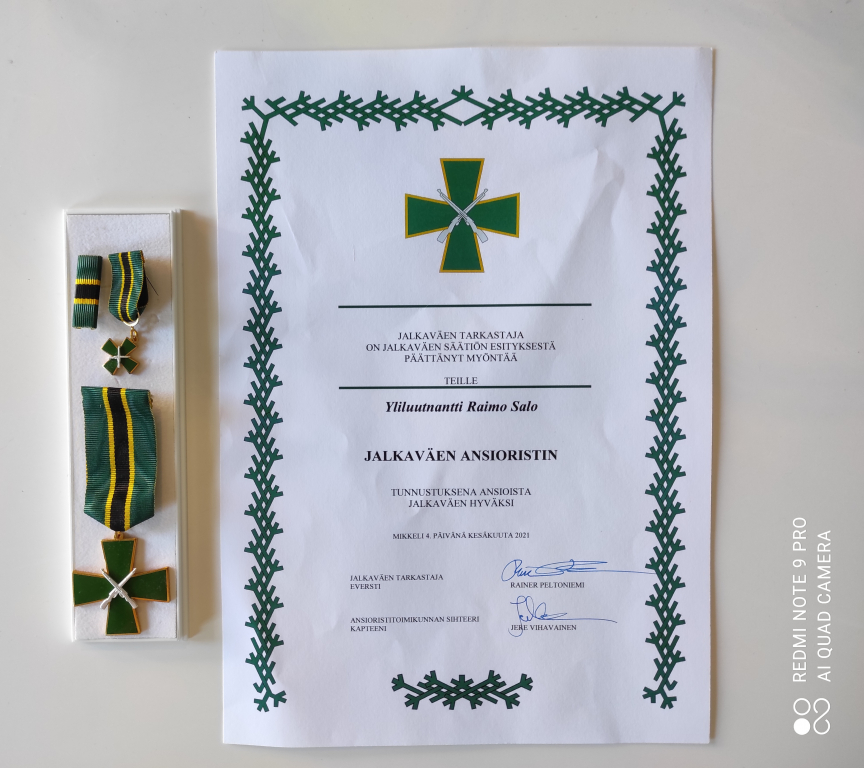 Jalkaväen tarkastaja on myöntänyt kyyjärveläiselle sotakamreeri Raimo Salolle Jalkaväen ansioristin 4.6.2021 tunnustuksena ansioista jalkaväen hyväksi. Salo on taltioinut jalkaväessä sota-aikana taistelleiden veteraanien kokemuksia ja näitä haastatteluja on käytetty dokumenteissa. Salo on esiintynyt lukuisissa veteraanitapahtumissa ja esittänyt mm. Toivo Kärjen rintamalla säveltämää musiikkia.