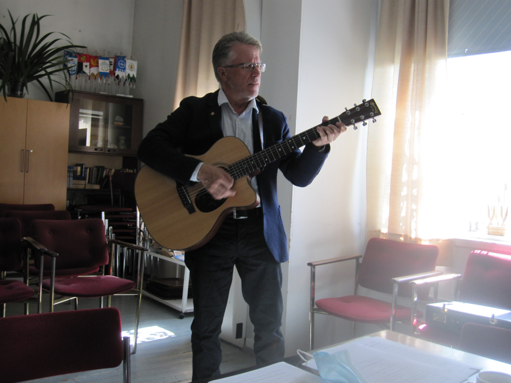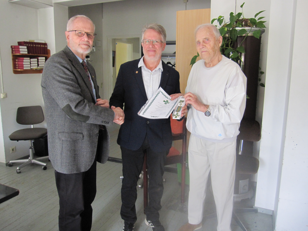 (Jyväskylän veteraanitalossa Raimo Salon kanssa kuvassa ovat vasemmalla liikuntaneuvos Pekka Toivonen ja oikealla rintamaveteraani Lasse Lehtinen, kuva Pekka Toivonen)