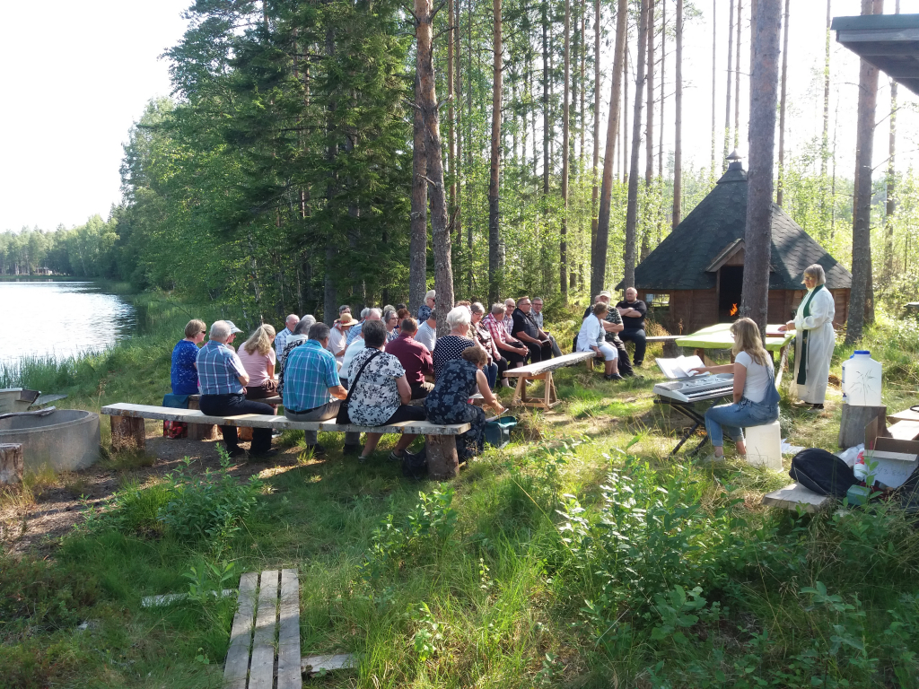 Valkeislammen kodalla on jumalanpalvelusta toimittamassa pastori Raimo Kytölä. Saunakylän väki tarjoaa jumalanpalveluksen päätteeksi nokipannukahvit kirkkoväelle.