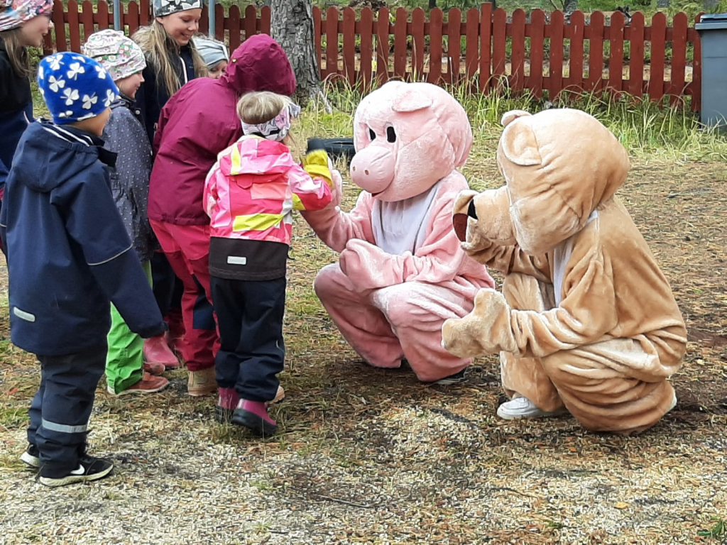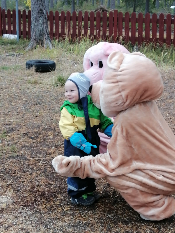 Nalle ja possukin olivat saapuneet paikalle. Lapset olivat kovin riemuissaan, kun maskotit puuhasivat heidän kanssaan palloleikkejä sekä jumppaa. Ja taisivat he saada aika paljon halauksia ja läpsyjäkin.