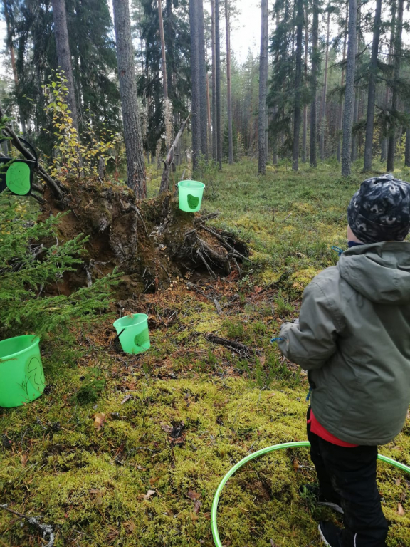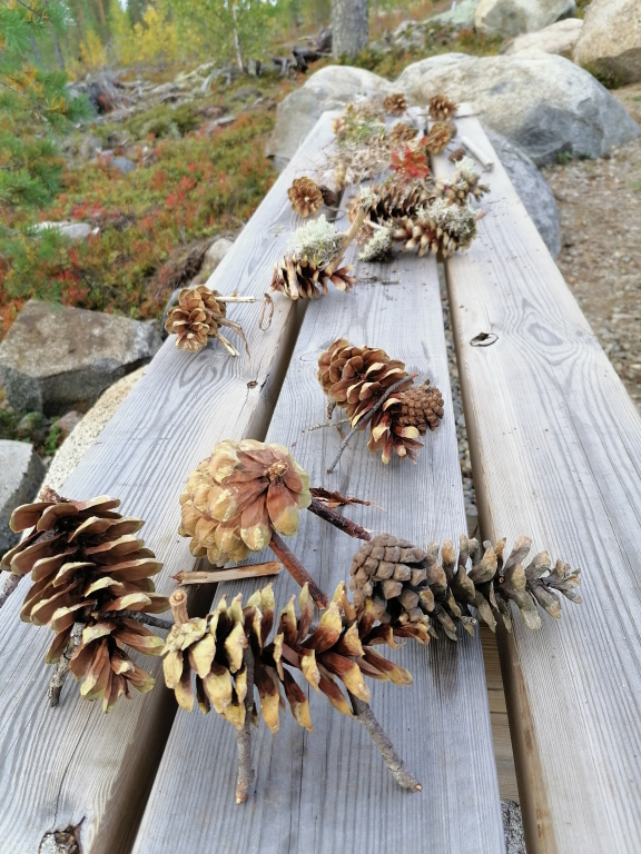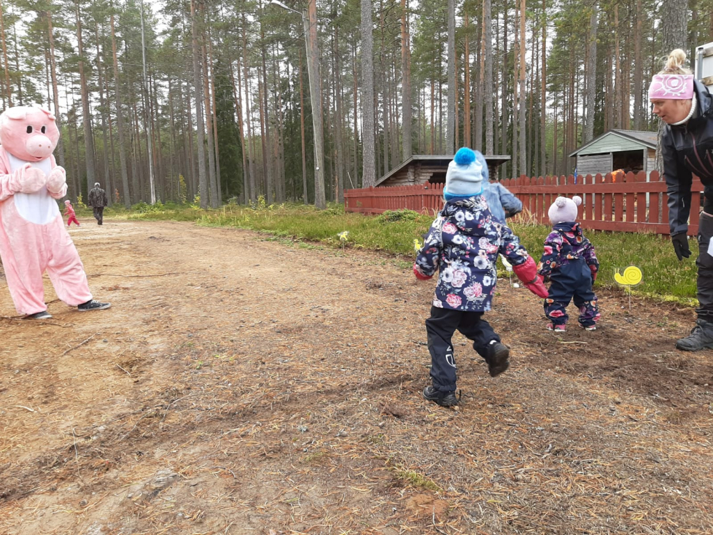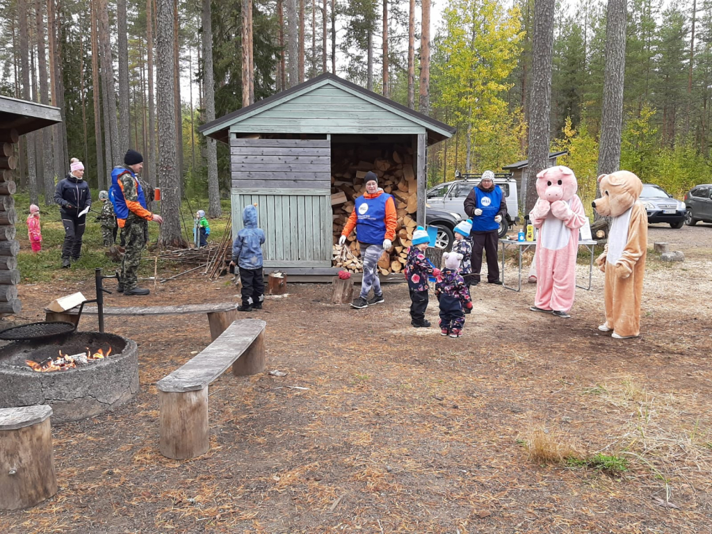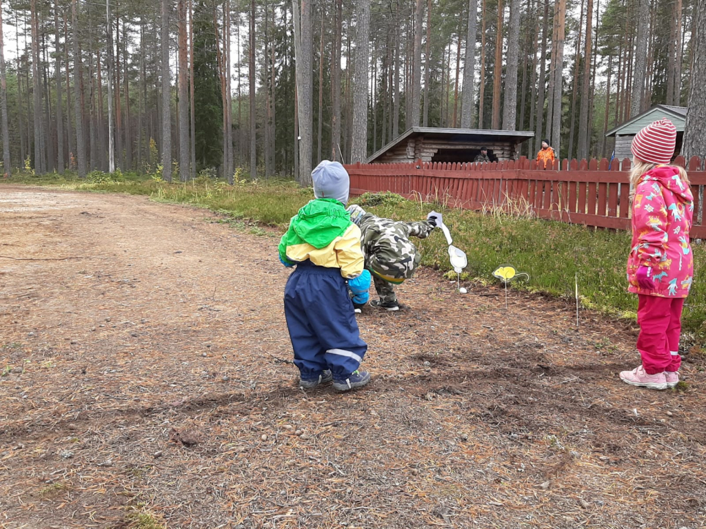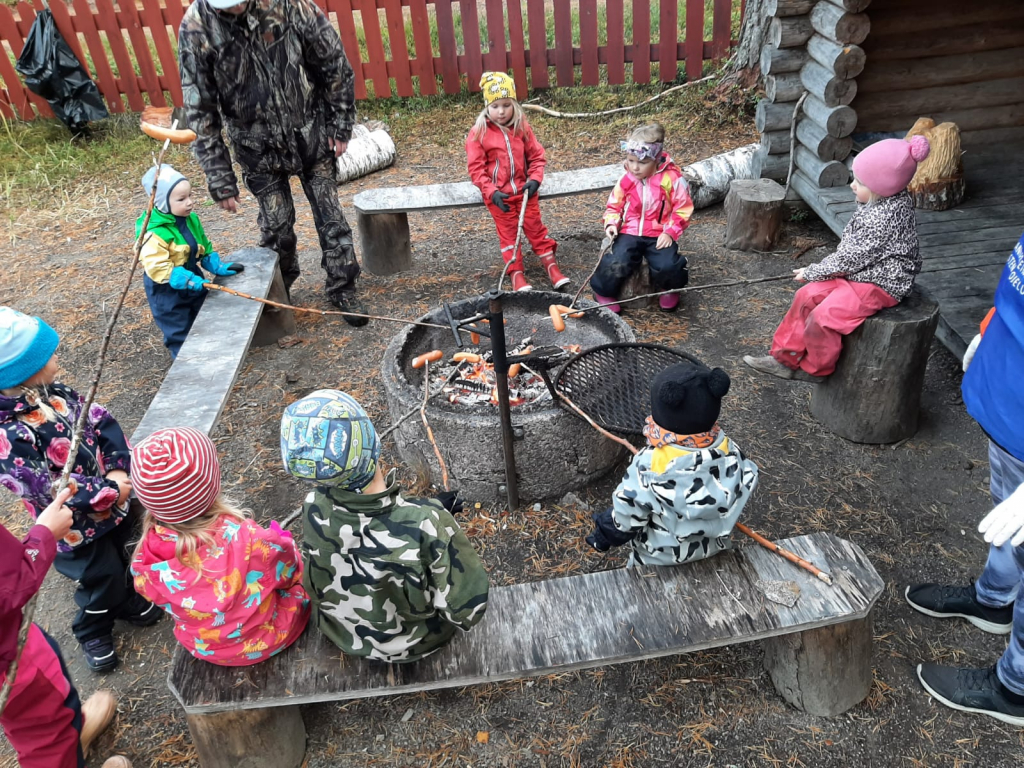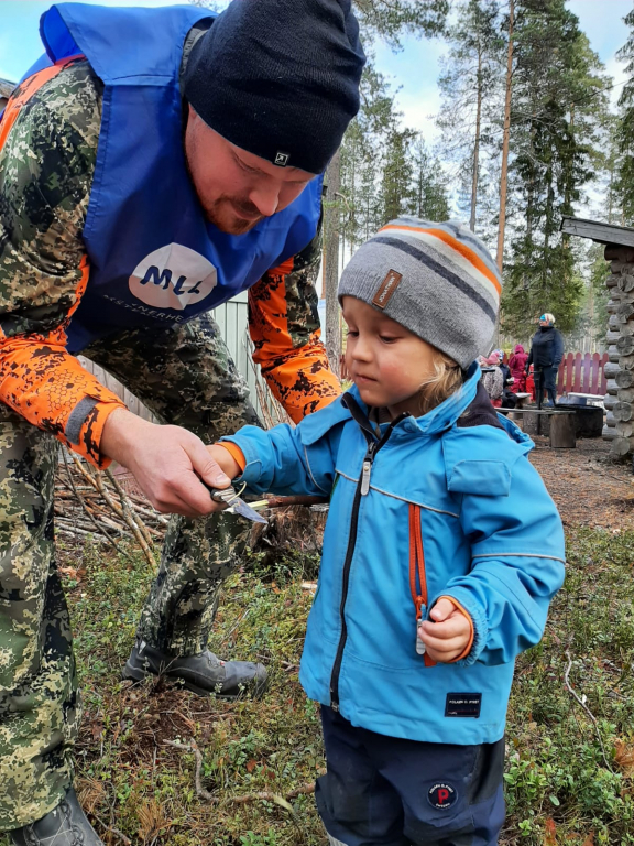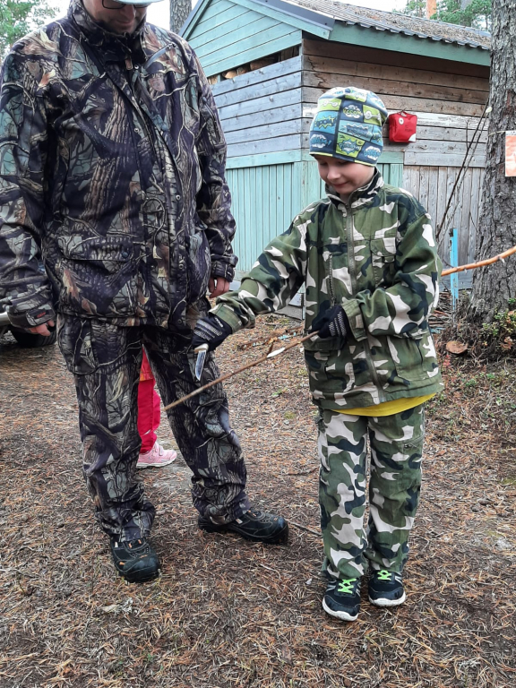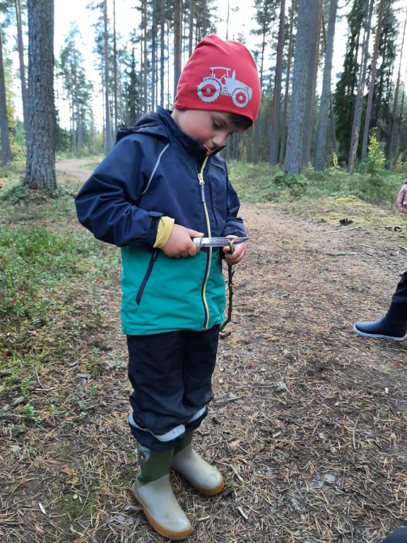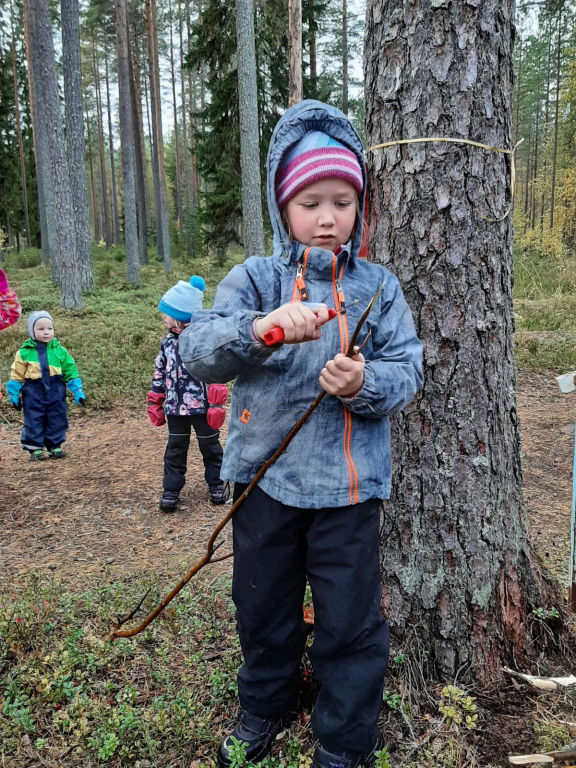 Tehtävinä rasteilla oli käpyjen heittelyä eri eläinten ämpäreihin, eläinten matkimista, hyppäämistä eläinradalla, käpylelujen rakentamista pikkupeikolle sekä makkaratikun vuoleminen. Itse tehdyllä makkaratikulla olikin sitten mukava paistaa makkaraa.