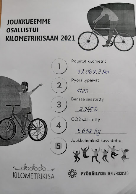 ps. Kisan viimeisillä päivillä = loppuvaiheessa en päässyt kirjaamaan järjestelmään uusia polkijoita mukaan. Ensi vuonna kannattaa olla heti yhteydessä, niin saadaan kaikki kilometrit yhteen. Tulos olisi vieläkin huikeampi.