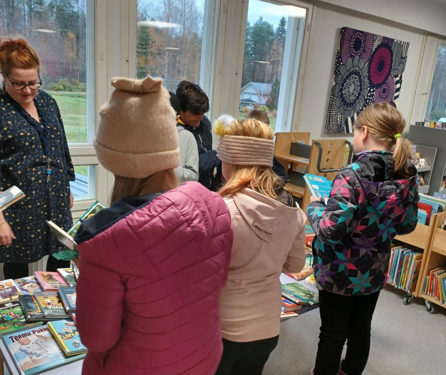 Muutamalle kouluryhmälle Tiina on järjestänyt kirjavinkkausta, esitellen kullekin ikääryhmälle sopivaa luettavaa aihepiireittäin. Oli niin mielenkiintoiset vinkkaukset, että itsekin teki mieli lainata vino pino nuorten kirjoja.