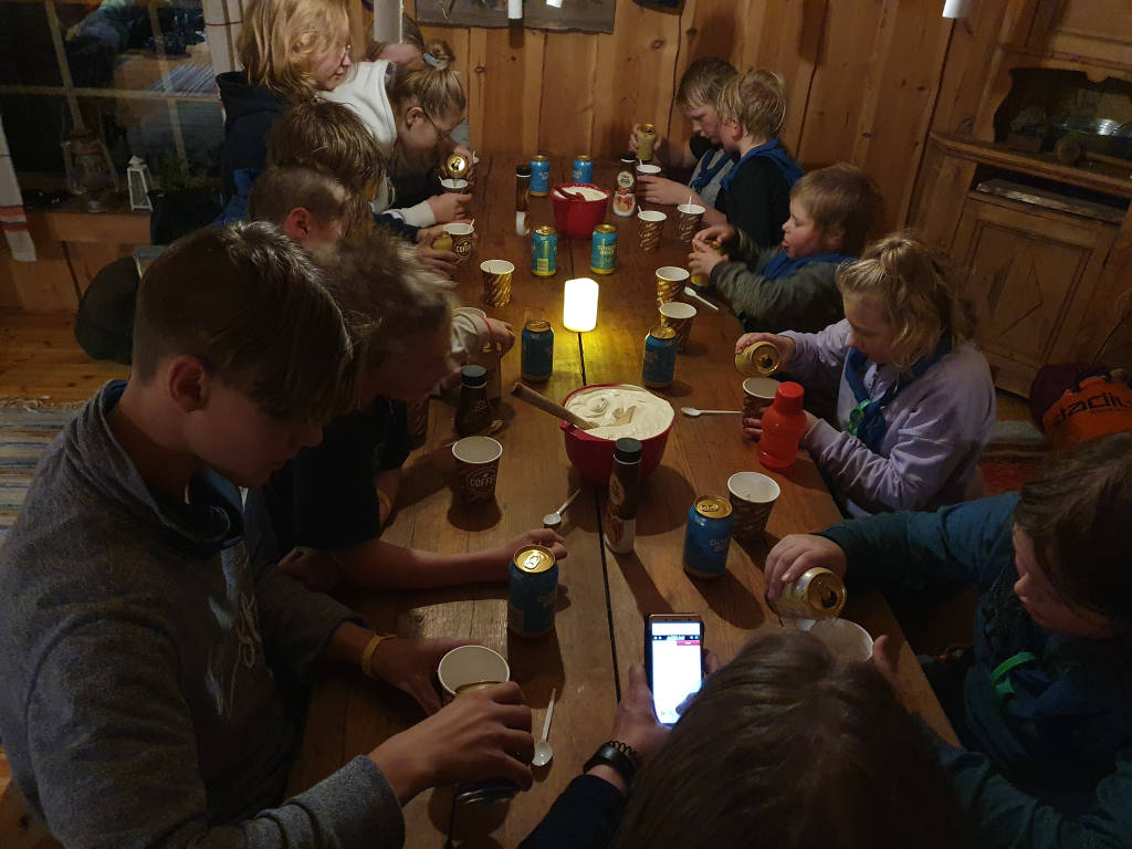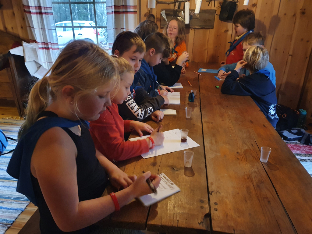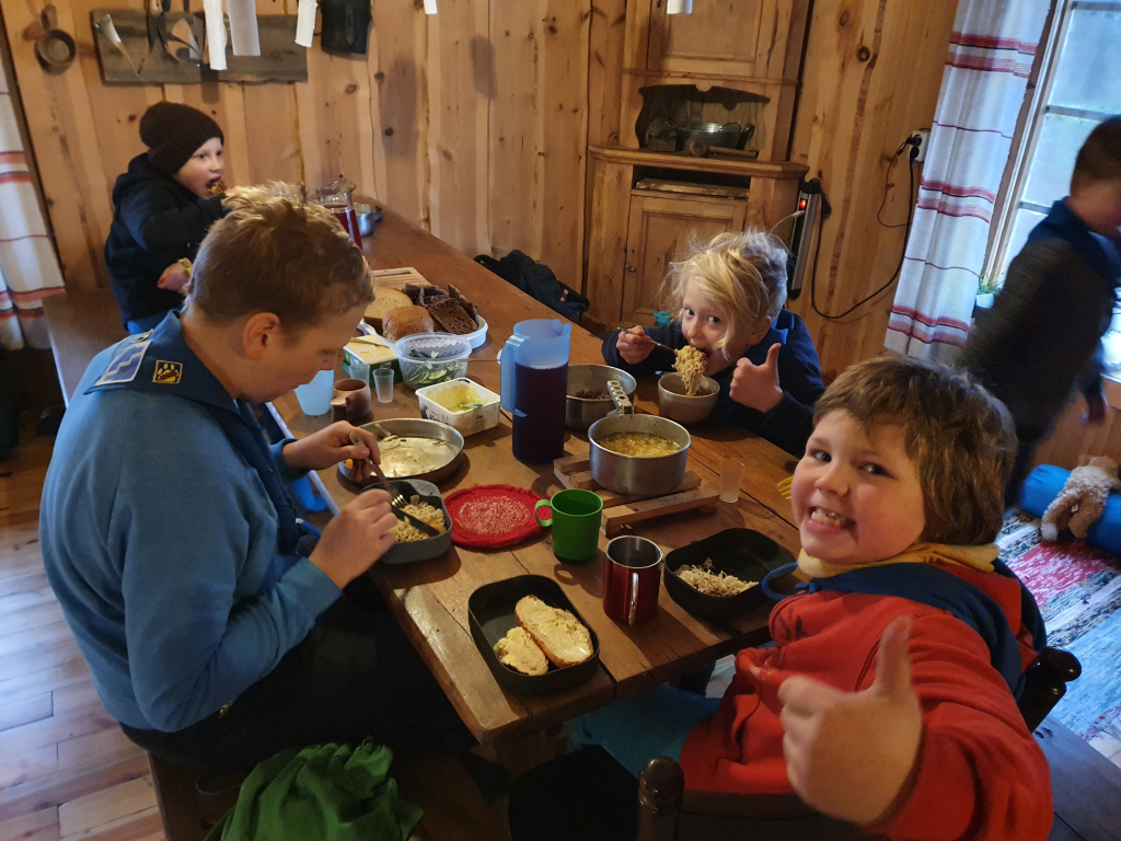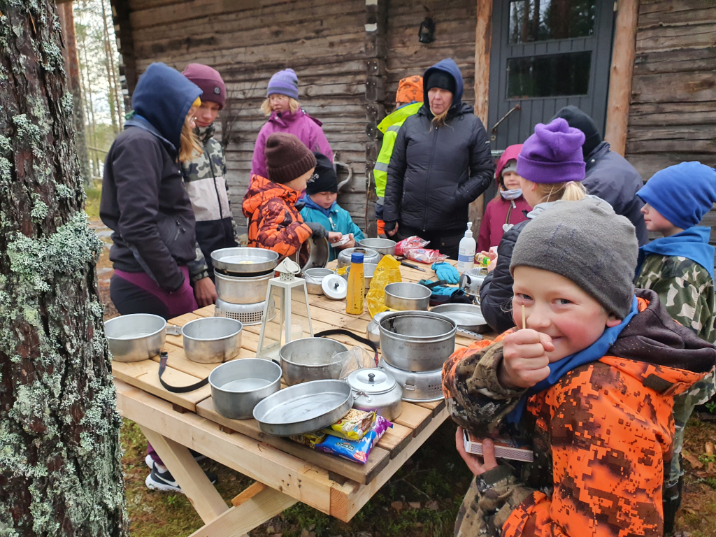 Palattuamme takaisin, jatkoimme koulupäivää huispauksen alkeilla. Huispaus on velhojen peli, jossa lennetään luudalla. Eli alkeet tarkoitti oman luudan tekemisestä. Luudanvarsia sai myös vuolemalla koristella mieleisekseen. Kun luudat olivat valmiina, siirryimme valvojaoppilaiden johdolla saunamökin edustalle. Jokaisen tuvan tehtävänä oli valmistaa itselleen päivällinen trangialla, eli retkikeittimellä. Keittimellä paistettiin jauhelihaa ja kasviksia, kiehautettiin nuudeleita sekä hartaudella haudutettiin makarooneja. Ruuan jälkeen toinen päiväretkellä ollut sudenpentu antoi partiolupauksensa, ja sai huivin kaulaansa. Sitten suunnattiin saunan rauhoittaviin löylyihin. Saunan jälkeen hämmästys oli suuri, sillä päärakennus oli muuttunut Kolmen luudanvarren baariksi. Jokainen sai sekoittaa itselleen Harry Potterin lempijuoman, eli kermakaljan (alkoholiton, makea juoma, jonka ohje on jutun lopussa). Tästä siirryimme suoraan iltapalaan, ja yllätykseksi saimme myös iltaohjelmaa: keksimme lyhyitä sketsejä, joita toisillemme esitimme. Lopuksi meille esiintyi vielä seikkailijoiden kuoro. Teimme vielä iltatoimet, ja kömmimme makuupusseihin. Unta ei tarvinnut kauaa houkutella.