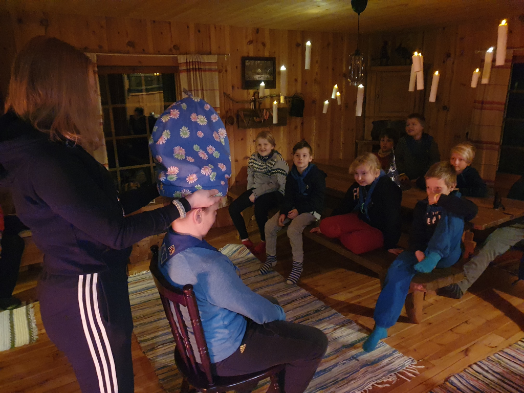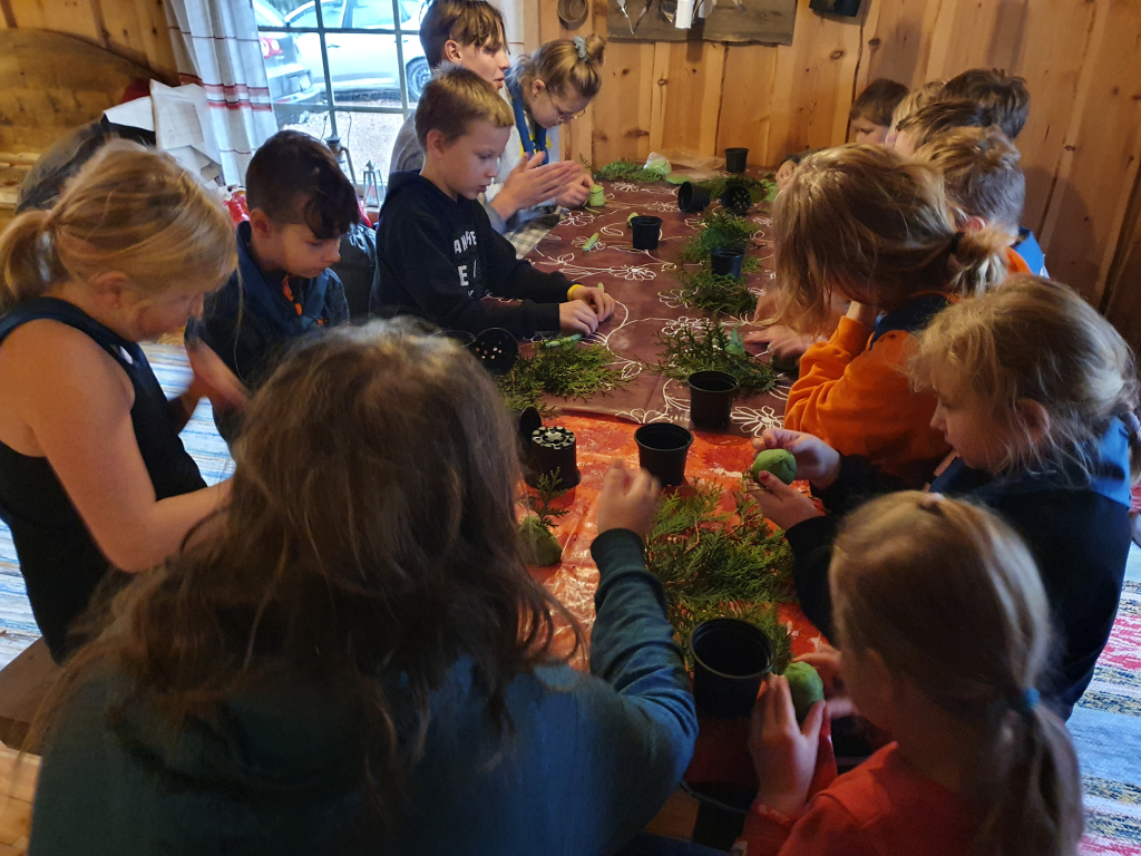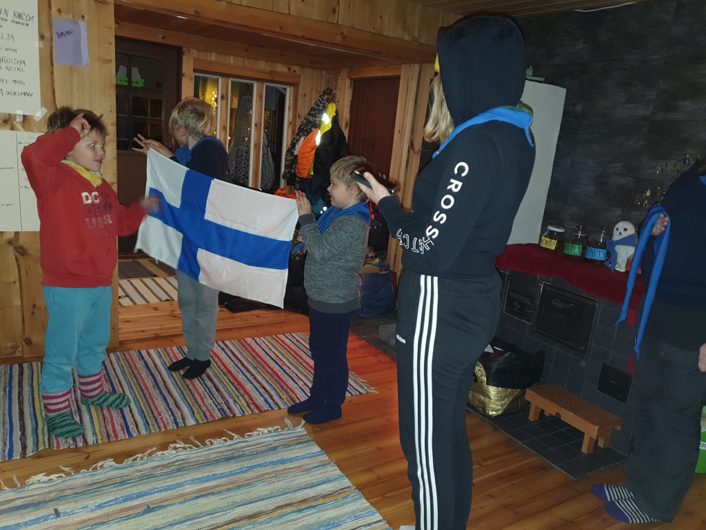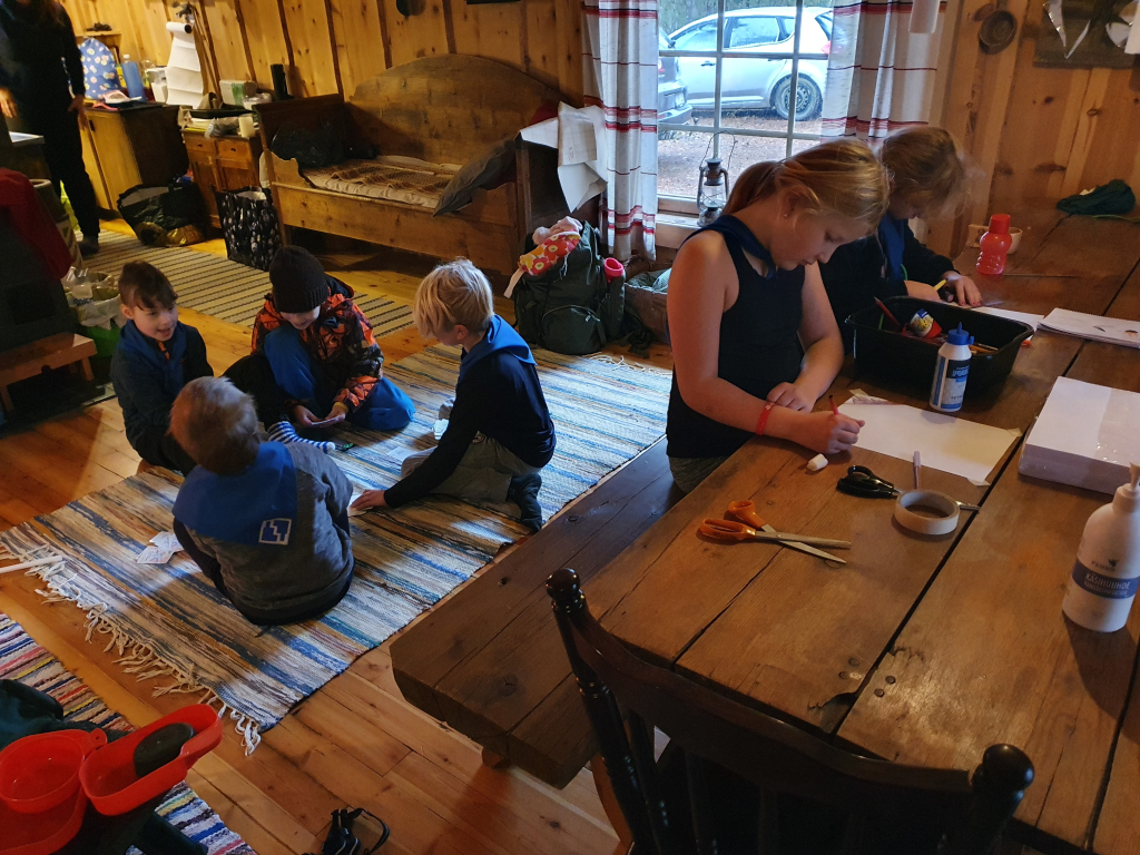 Palattuamme takaisin, jatkoimme koulupäivää huispauksen alkeilla. Huispaus on velhojen peli, jossa lennetään luudalla. Eli alkeet tarkoitti oman luudan tekemisestä. Luudanvarsia sai myös vuolemalla koristella mieleisekseen. Kun luudat olivat valmiina, siirryimme valvojaoppilaiden johdolla saunamökin edustalle. Jokaisen tuvan tehtävänä oli valmistaa itselleen päivällinen trangialla, eli retkikeittimellä. Keittimellä paistettiin jauhelihaa ja kasviksia, kiehautettiin nuudeleita sekä hartaudella haudutettiin makarooneja. Ruuan jälkeen toinen päiväretkellä ollut sudenpentu antoi partiolupauksensa, ja sai huivin kaulaansa. Sitten suunnattiin saunan rauhoittaviin löylyihin. Saunan jälkeen hämmästys oli suuri, sillä päärakennus oli muuttunut Kolmen luudanvarren baariksi. Jokainen sai sekoittaa itselleen Harry Potterin lempijuoman, eli kermakaljan (alkoholiton, makea juoma, jonka ohje on jutun lopussa). Tästä siirryimme suoraan iltapalaan, ja yllätykseksi saimme myös iltaohjelmaa: keksimme lyhyitä sketsejä, joita toisillemme esitimme. Lopuksi meille esiintyi vielä seikkailijoiden kuoro. Teimme vielä iltatoimet, ja kömmimme makuupusseihin. Unta ei tarvinnut kauaa houkutella.