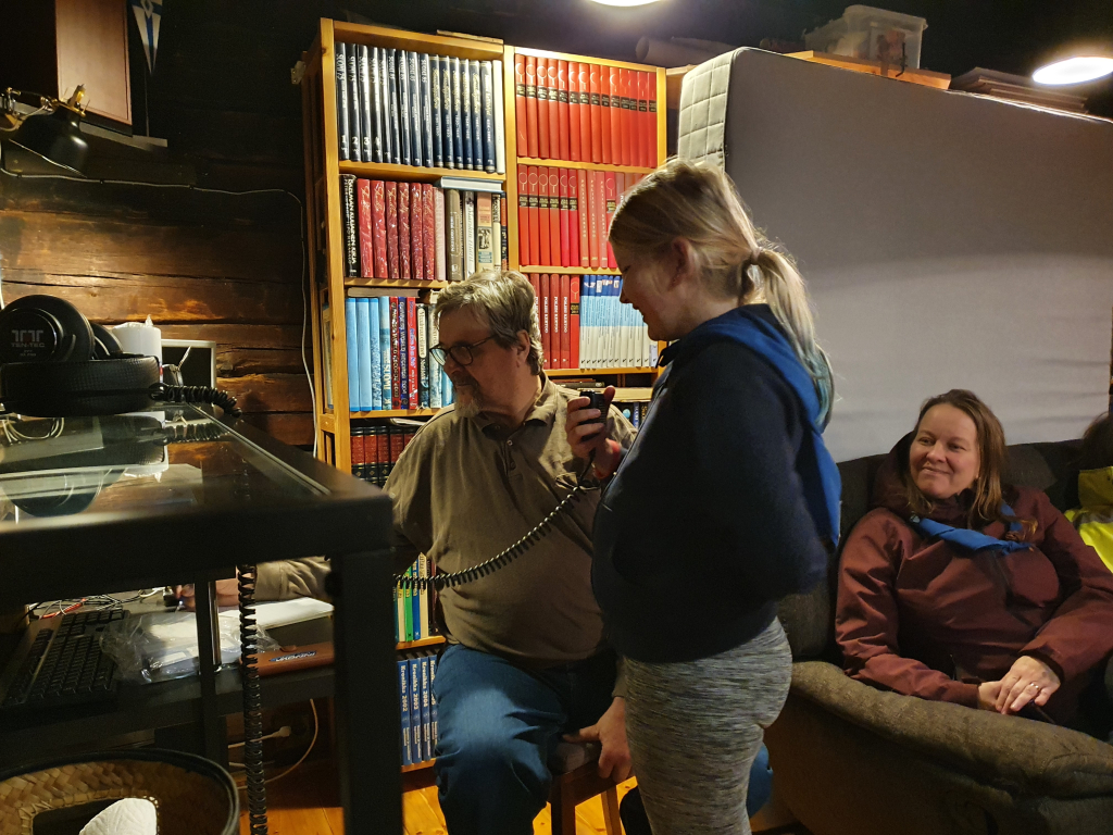 Lounaan jälkeen pihaan ilmestyi Uusisalon bussi, ja lähdimme matkalle kohti tuntematonta määränpäätä. Bussi kurvasi lopulta Sahapakan vanhan riihen nurkalle, ja pian huomasimme olevamme keskellä kansainvälistä JOTA-partiotapahtumaa! Kyseessä on siis maailman suurin vuosittainen partiotapahtuma. Matti Lillvis sekä Risto Pölkki avasivat meille radioviestinnän maailmaa. Muutama partiolainen uskaltautui myös tarttumaan mikkiin, ja esittelemään itsensä yhteyden toisessa päässä olleelle. Oli todella jännittävä ja mielenkiintoinen vierailu radioaalloilla!