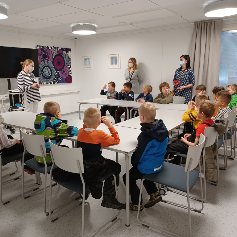Opettajansa Riitta Raivion johdolla ekaluokkaiset reippailivat kirjastoon. Ennen korttien jakoa oli tietenkin lyhyt opastustuokio kirjaston käytöstä.