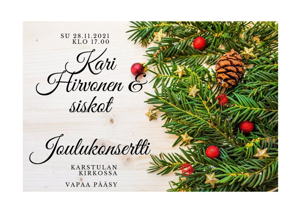 Karstulan Seudun Sydänyhdistys järjestää Joulukonsertin, jossa esiintyy vuoden 2003 tangokuningas, Kari Hirvonen & siskot.