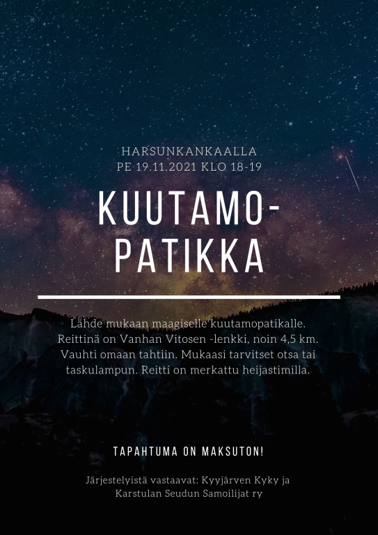 Lähtö: Liukuva lähtö klo 18 alkaen Harsunkankaan laavulta. Vauhti omaan tahtiin.