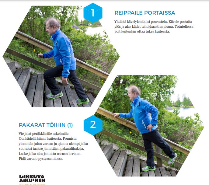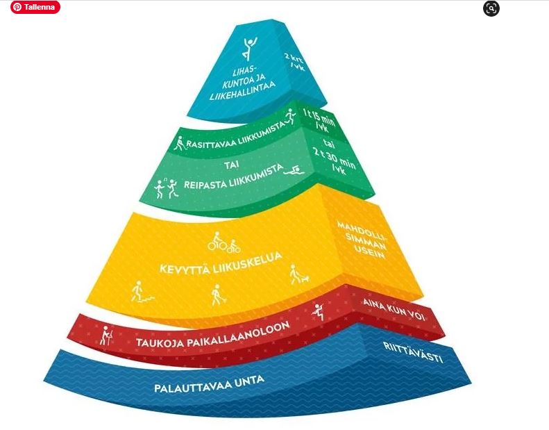 - Muutaman minuutin pätkät kerrallaan riittävät. Liikkumisen suosituksena on sydämen sykettä kohottavaa liikettä eli reipasta liikuntaa suositellaan tehtäväksi 2 tuntia 30 min viikossa. Samat terveyshyödyt saa myös lisäämällä liikkumisen tehoa rasittavaksi, jolloin 1 tunti 15 min viikossa riittää. Lihaskuntoa ja liikehallintaa tulisi harjoittaa vähintään kaksi (2) kertaa viikossa.
