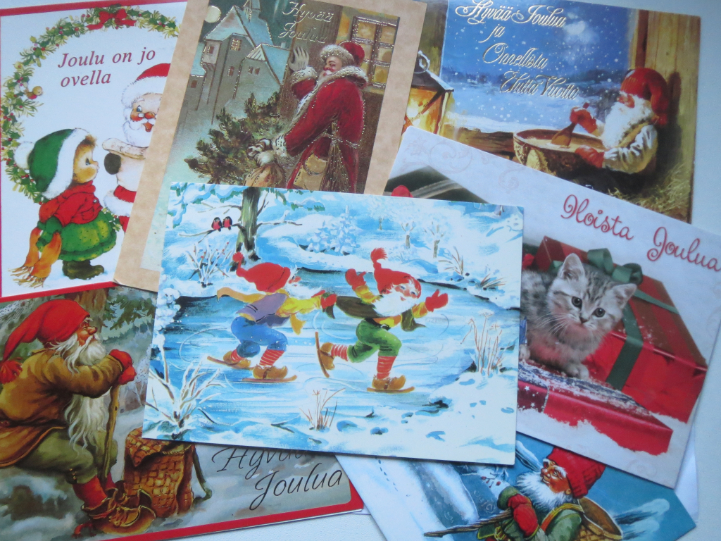 Kotimaahan ei sillon vielä rengänny joulukorttia lähetellä ku kaikki sukulaiset asu samalla kylällä. Hyvvää Joulua toivotettiin viemällä lämpönen leipä tai rieska, makkeapussi ja 60-luvulla jo joulukukka. Joku vitsaili, ettei joulukukkia tarvihte ostaa ku yks. Vastalahajaks saa aina kukan. Seuraavassa paikassa sama meininki. Joka joulu tuli kumminkin muutama kortti joiltain ystäviltä kauempaa. Ei muuta ku het joulun jäläkeen uuvven vuojen korttia hommaamaan. Niissä ei ollu palijon valikoimaa, luminen maisema tai hoppean värinen hevosenkenkä, mutta pitihän siihen joulukorttiin vastata.