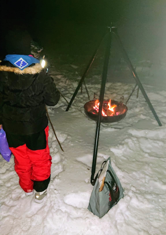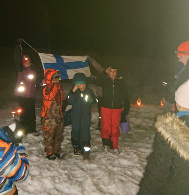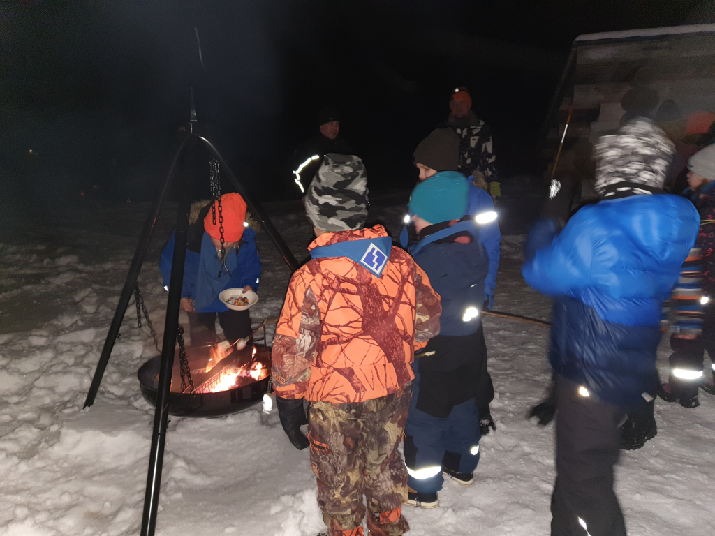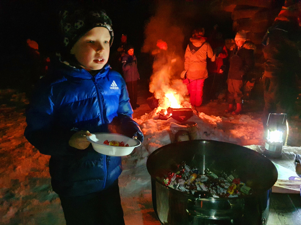 Illan päätteeksi nostettiin esille iso kattila, ja kaikkia kehotettiin ottamaan esiin ruokailuvälineet ja järjestäytymään jonoon. Vaan kattilassa ei ollutkaan monen odottamaa riisipuuroa, vaan karkkeja. Mikä pettymys! Karkkipuuro teki kuitenkin hyvin kauppansa, eikä yhtään päätynyt biojätteeseen. “Puuron” kaveriksi sai paahtaa vaahtokarkkeja nuotiolla, ja tarjolla oli myös mehua sekä glögiä.