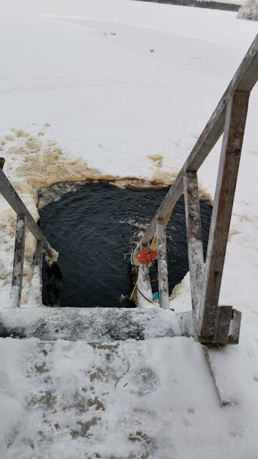 Avantoa huollettu ja jälleen pääsee pulahtelemaan. Äärimmäistä varovaisuutta liikuttaessa laiturin ja portaiden alueella liukkauden vuoksi.
