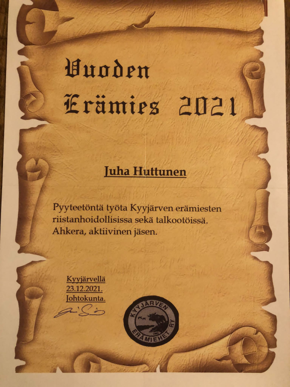Vapaa-aika 24.12.2021 Kyyjärven Erämiehet ry Erkki Koivisto Vuoden 2021 Erämies Kyyjärven Erämiehet ry:n johtokunta on valinnut monista hyvistä erämiehistä vuoden 2021 Erämiehen joka on Juha Huttunen Jaa sosiaalisessa mediassa Aihealueen yhteistyöyritykset