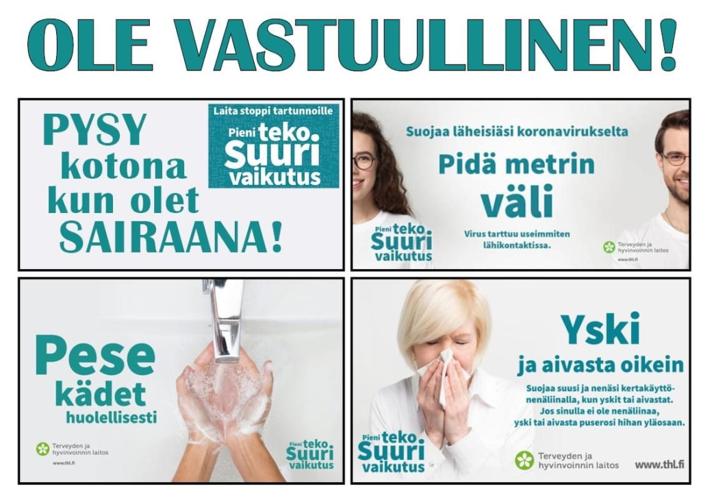 Koronarokotteet, käsihygienia, turvaetäisyydet ja maskien käyttö on suositeltavaa.