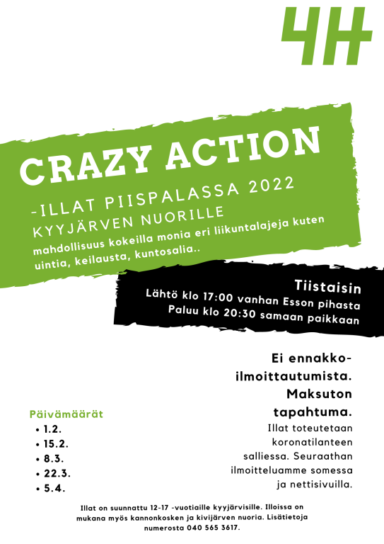 Nuorille (12-17 v.) suunnatut Crazy action -illat Piispalassa starttaavat koronatilanteen salliessa viikolla 5. Seuraa siis vielä ilmoittelua somessa ja nettisivuilla!