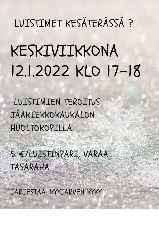 Jääkiekkokaukalon huoltokopilla on mahdollisuus käydä teroittamassa luistimet KESKIVIIKKONA 12.1.2022 klo 17-18.