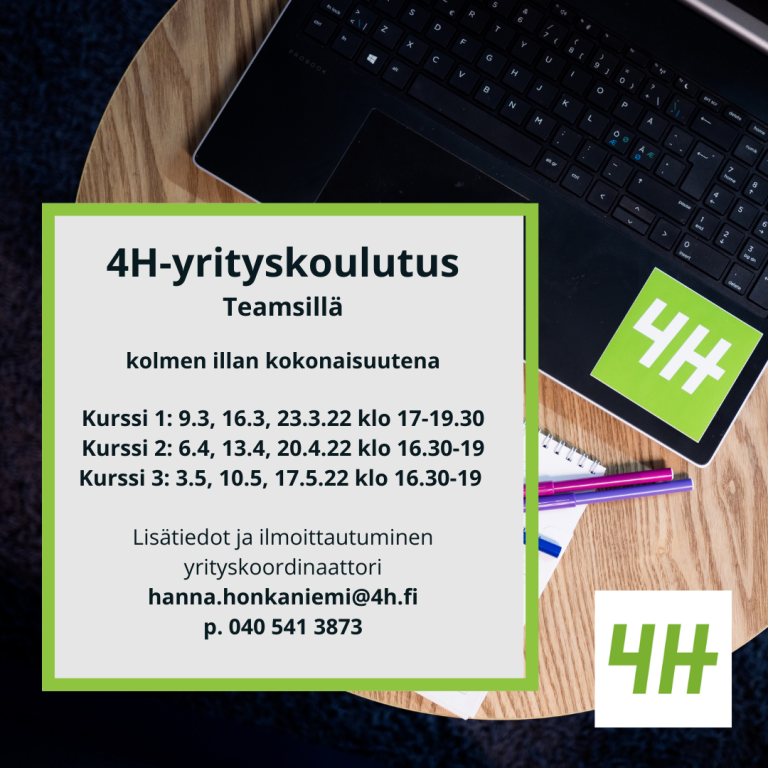 4H-yrityskoulutuksen (1op) voi suorittaa myös itsenäisesti verkossa milloin tahansa itsellesi sopii. Omatoimiseen yrityskoulutukseen pääset tästä linkistä.