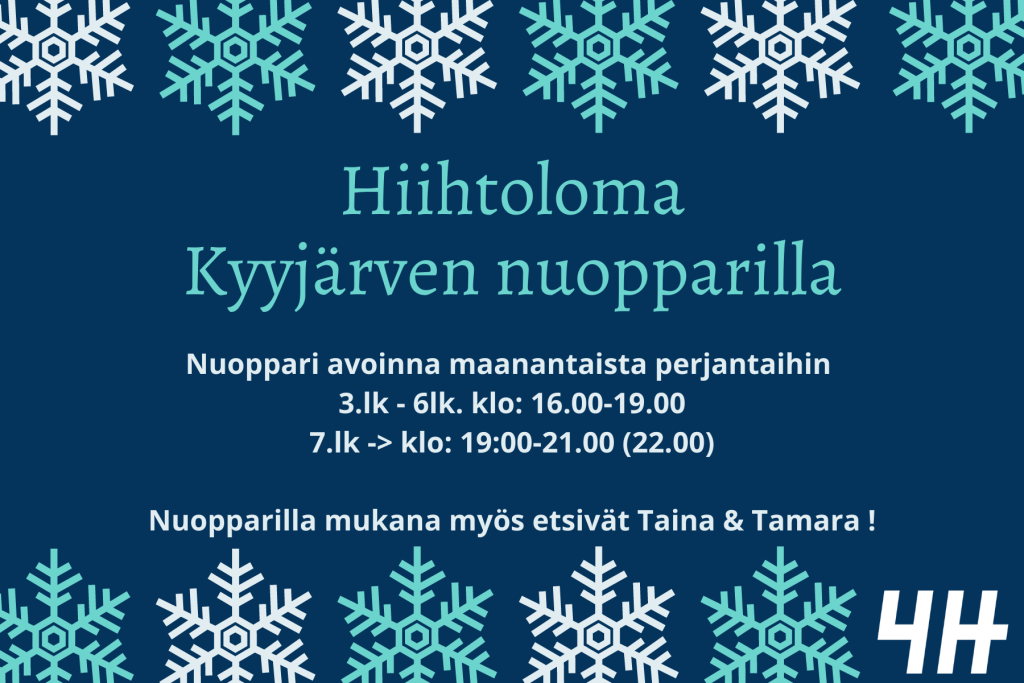 Lomaviikon ohjelma sijoittuu nuorisotalolle. Nuopparilla on mahdollisuus pelata, leikkiä, leipoa tai mitä muuta hauskaa keksitäänkään! Ohjelma on maksutonta, paitsi laskiaisriehan osallistumismaksu on 5€, 4H-jäsenille maksuton. Mainokset toiminnasta löytyy tämän julkaisun kuvia selaamalla.