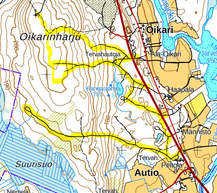 Kartalle piirretty polut, joita pitkin pääsee kävelemään. Vaihtoehtoja löytyy ja eksymään ei pääse. Oikarin polut tarjoavat hyvää vaihtelua, sillä mastolle mentäessä on hyvää loivaa nousua koko matkan.