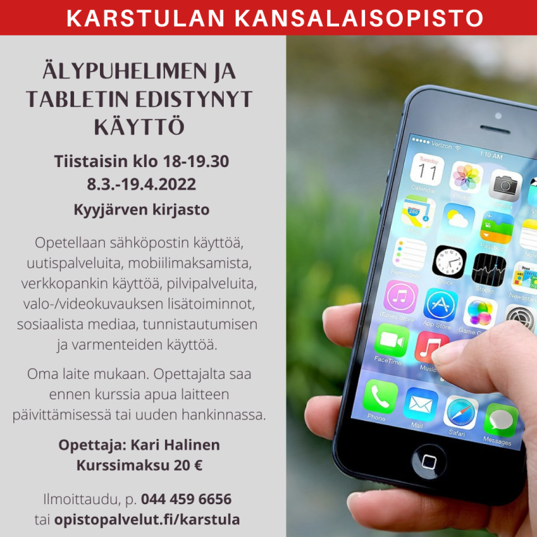 Opetellaan sähköpostin käyttöä, uutispalveluita, mobiilimaksamista, verkkopankin käyttöä, pilvipalveluita, valo-/videokuvauksen lisätoiminnot, sosiaalista mediaa, tunnistautumisen ja varmenteiden käyttöä. Kirjasuositus Ulla Sannikka: Seniorin älypuhelinopas (kirjastosta tai esim. Alma Talent verkkokaupasta). Oma laite mukaan, Android 9 tai uudempi. Opettajalta saa ennen kurssia apua päivittämisessä/ uuden hankinnassa.