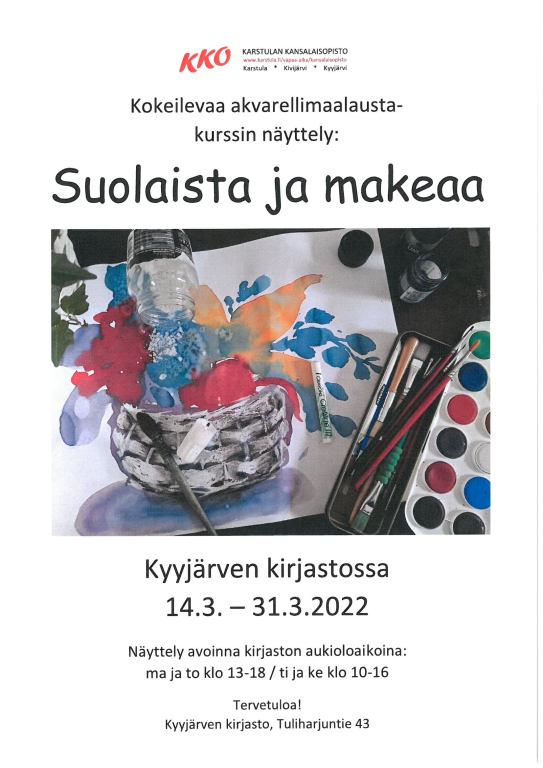 Karstulan kansalaisopiston järjesti Kyyjärvellä Kokeilevaa akvarellimaalausta- kurssin. Nyt me kaikki pääsemme nauttimaan kurssilaisten aikaansaanoksista Suolaista ja makeaa - näyttelyn myötä.