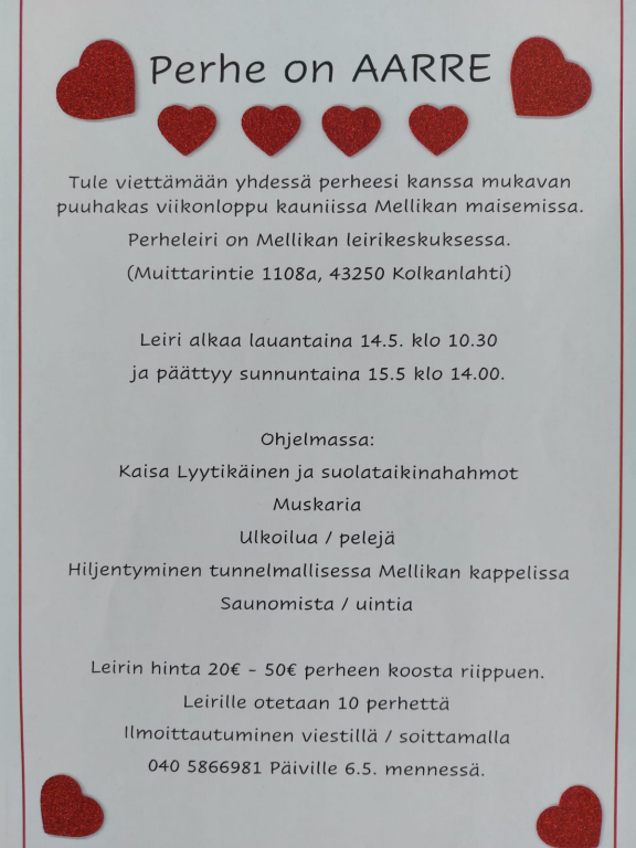 Lapset ja nuoret 29.04.2022 Kyyjärven kappeliseurakunta Riitta Kytölä Perheleirille toukokuussa! Saarijärven seurakunta järjestää perheleirin Mellikassa 14.-15.5. Ilmoittautumiset 6.5. mennessä viestillä tai soittamalla p. 040-586 6981. Jaa sosiaalisessa mediassa Aihealueen yhteistyöyritykset