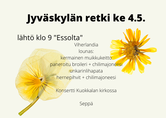 Viimeistään klo 12.30 siirrymme Kuokkalan kirkkoon Petri Laaksosen konserttiin. Konsertti kestää n.tunnin.