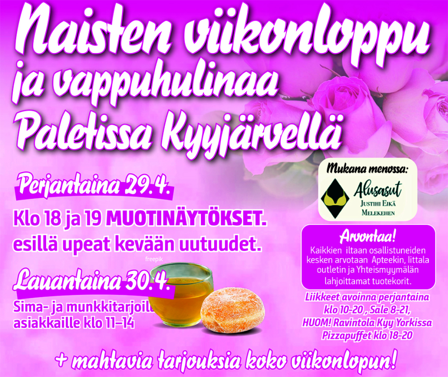 Kevät keikkuen tulevi ja tuleva viikonloppu on tapahtumia täynnä myös Kauppakeskus Paletissa Kyyjärvellä. Perjantaina 29.4.vietetään Naisteniltaa muotinäytöksen merkeissa, joten nyt kannattaa lähteä katsomaan, miten upeita asuja kevään ja kesän juhliin löytyy täältä sekä aikuisille että lapsille. Muotinäytökset nähdään klo 18 ja 19. Ravintola Kyy Yorkissa on maukas pizzapuffet 18-20.. Illan aikana on toki arvontaakin, Yhteismyymälä, Apteekki ja Iittala outletin myymälä ovat lahjoittaneet hienot tuotekorit. Kaikki liikkeet ovat auki 10-20 ja Sale 8-21.