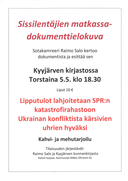 Sotakamreeri Raimo Salo kertoo dokumentista ja esittää sen Kyyjärven kirjastossa torstaina 5.5. klo 18.30. Dokumentin jälkeen saamme nauttia myös musiikkituokiosta Raimo Salon johdolla.
